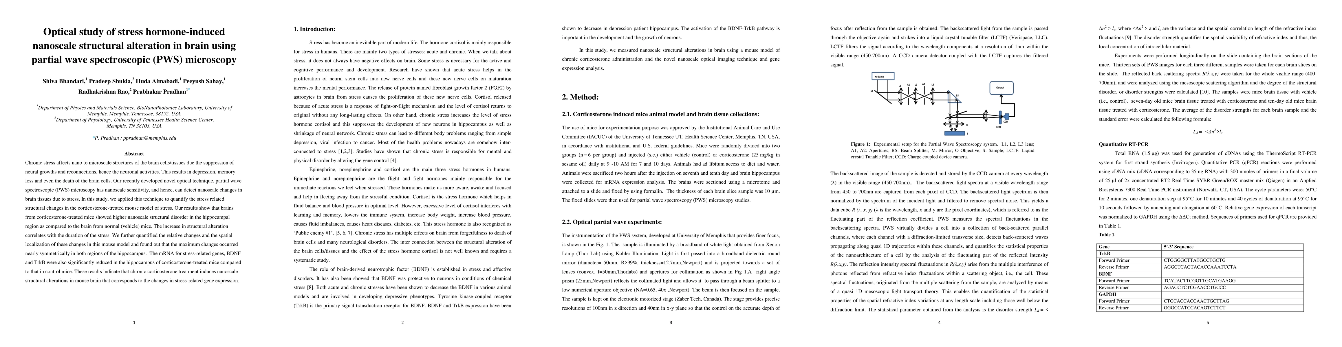 This study uses partial wave spectroscopic (PWS) microscopy to detect nanoscale structural changes in the brains of corticosterone-treated mice, revealing increased disorder in the hippocampus correlating with stress duration. The findings link these structural alterations with reduced expression of stress-related genes BDNF and TrkB.
