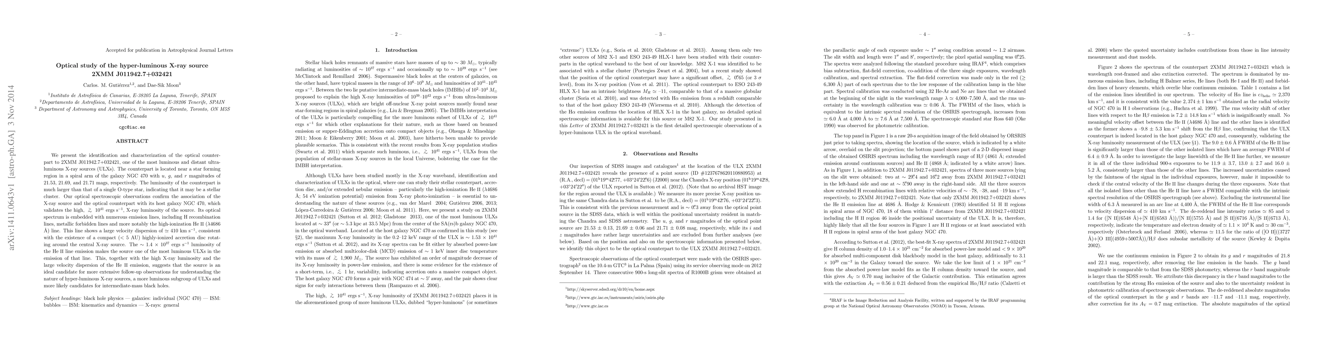 This study identifies and characterizes the optical counterpart of the hyper-luminous X-ray source 2XMM J011942.7+032421, revealing it to be a stellar cluster in the galaxy NGC 470. The source exhibits high X-ray luminosity and significant HeII emission, suggesting it may harbor an intermediate-mass black hole.