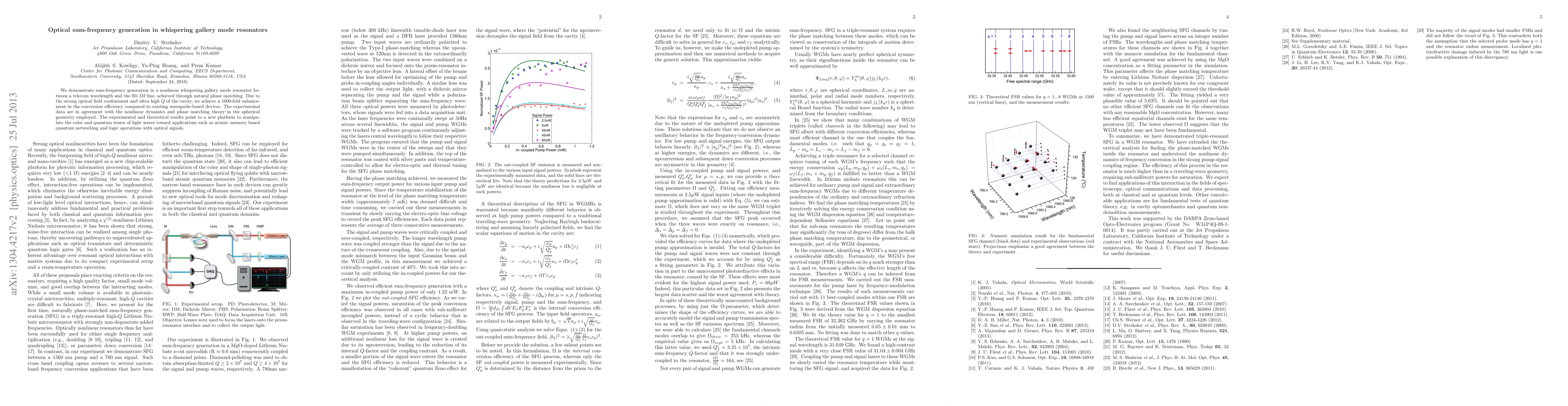 This study demonstrates enhanced sum-frequency generation in whispering gallery mode resonators, achieving a 1000-fold increase in efficiency compared to waveguide devices, thanks to strong field confinement and high Q-factors. The results support theoretical models and suggest potential for advanced quantum networking and optical logic operations.