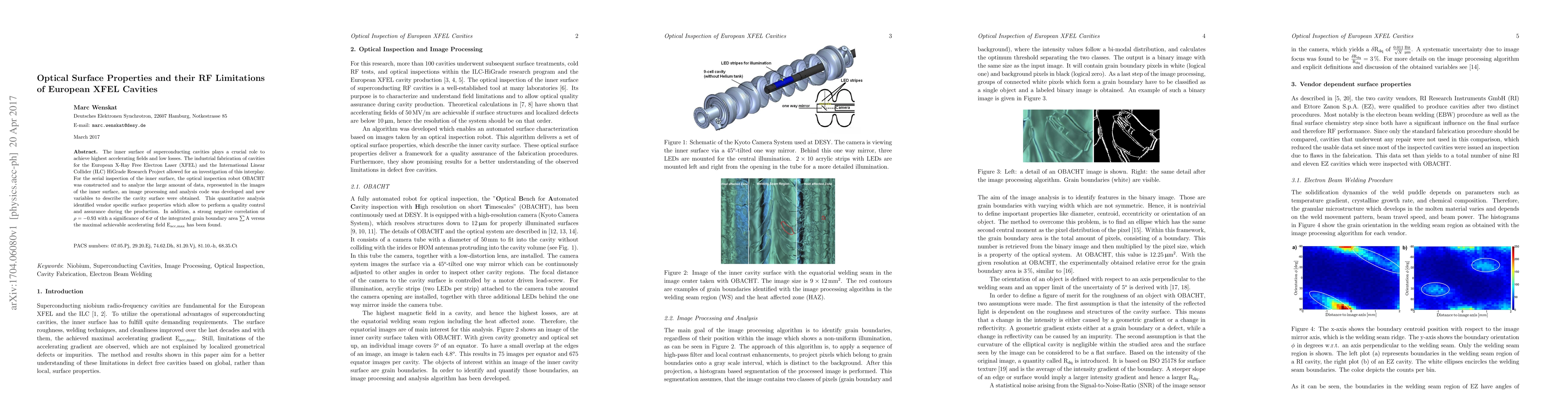 The inner surface of superconducting cavities plays a crucial role to achieve highest accelerating fields and low losses. The industrial fabrication of cavities for the European X-Ray Free Electron Laser (XFEL) and the International Linear Collider (ILC) HiGrade Research Project allowed for an investigation of this interplay. For the serial inspection of the inner surface, the optical inspection robot OBACHT was constructed and to analyze the large amount of data, represented in the images of the inner surface, an image processing and analysis code was developed and new variables to describe the cavity surface were obtained. This quantitative analysis identified vendor specific surface properties which allow to perform a quality control and assurance during the production. In addition, a strong negative correlation of $\rho= -0.93$ with a significance of $6\,\sigma$ of the integrated grain boundary area $\sum{\mathrm{A}}$ versus the maximal achievable accelerating field $\mathrm{E_{acc,max}}$ has been found.