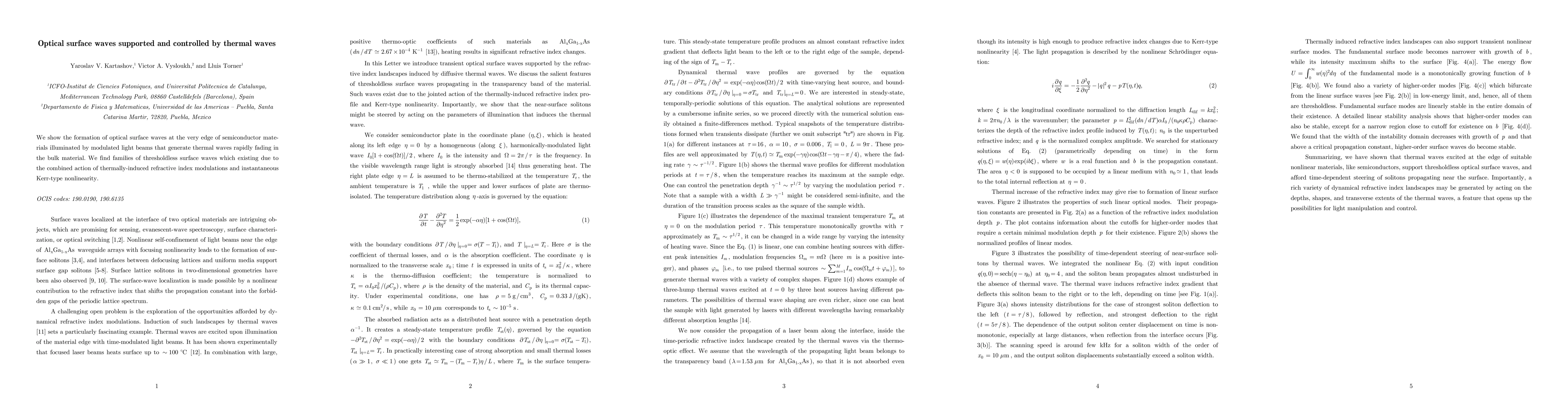 We address the formation of optical surface waves at the very edge of semiconductor materials illuminated by modulated light beams that generate thermal waves rapidly fading in the bulk material. We find families of thresholdless surface waves which existing due to the combined action of thermally-induced refractive index modulations and instantaneous Kerr-type nonlinearity.