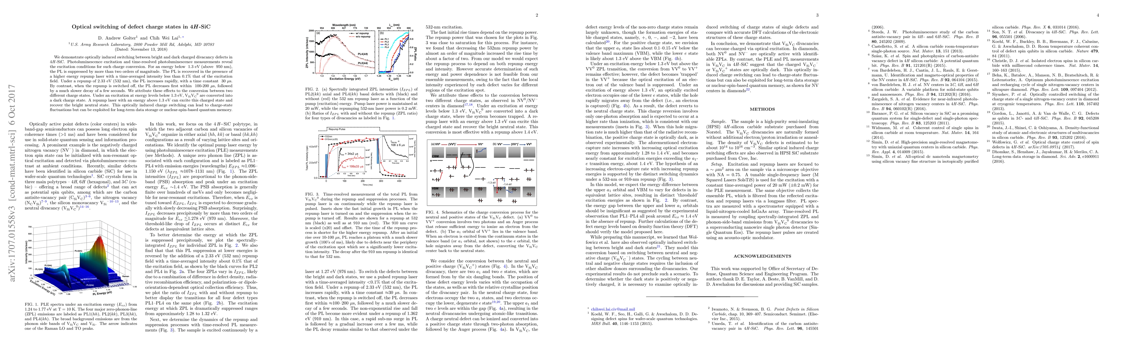 This study demonstrates optically induced switching between bright and dark charged divacancy defects in 4H-SiC using photoluminescence techniques. It reveals that below ~1.3 eV, defects convert to a dark state, while a repump laser above 1.3 eV can recover the bright state, suggesting potential for data storage or quantum memory applications.