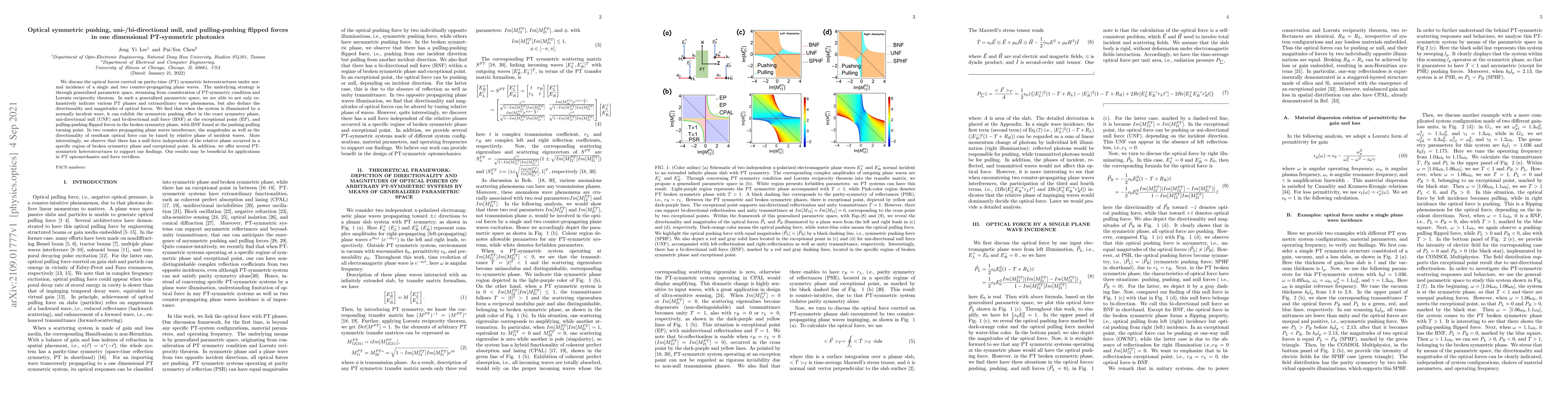 We discuss the optical forces exerted on parity-time (PT) symmetric heterostructures under normal incidence of a single and two counter-propagating plane waves. The underlying strategy is through generalized parametric space, stemming from consideration of PT-symmetry condition and Lorentz reciprocity theorem. In such a generalized parametric space, we are able to not only exhaustively indicate various PT phases and extraordinary wave phenomena, but also deduce the directionality and magnitudes of optical forces. We find that when the system is illuminated by a normally incident wave, it can exhibit the symmetric pushing effect in the exact symmetry phase, uni-directional null (UNF) and bi-directional null force (BNF) at the exceptional point (EP), and pulling-pushing flipped forces in the broken symmetry phase, with BNF found at the pushing-pulling turning point. In two counter-propagating plane waves interference, the magnitudes as well as the directionality of resultant optical force can be tuned by relative phase of incident waves. More interestingly, we observe that there has a null force independent of the relative phase occurred in a specific region of broken symmetry phase and exceptional point. In addition, we offer several PT-symmetric heterostructures to support our findings. Our results may be beneficial for applications in PT optomechanics and force rectifiers.