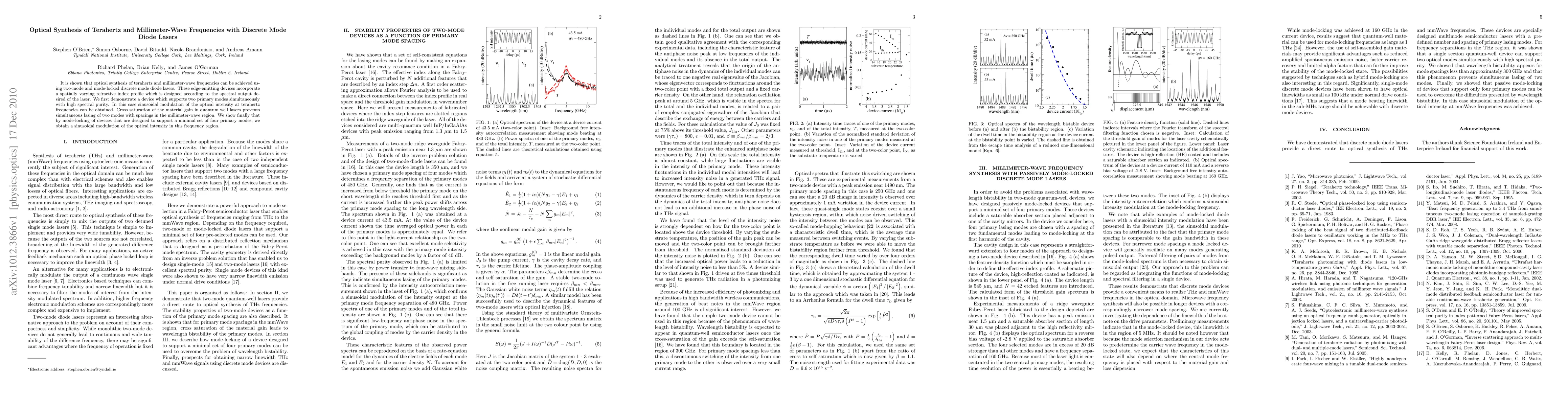 This paper demonstrates optical synthesis of terahertz and millimeter-wave frequencies using two-mode and mode-locked discrete mode diode lasers with tailored refractive index profiles. The study achieves high spectral purity and sinusoidal modulation at terahertz frequencies, while mode-locking enables similar modulation in the millimeter-wave region.