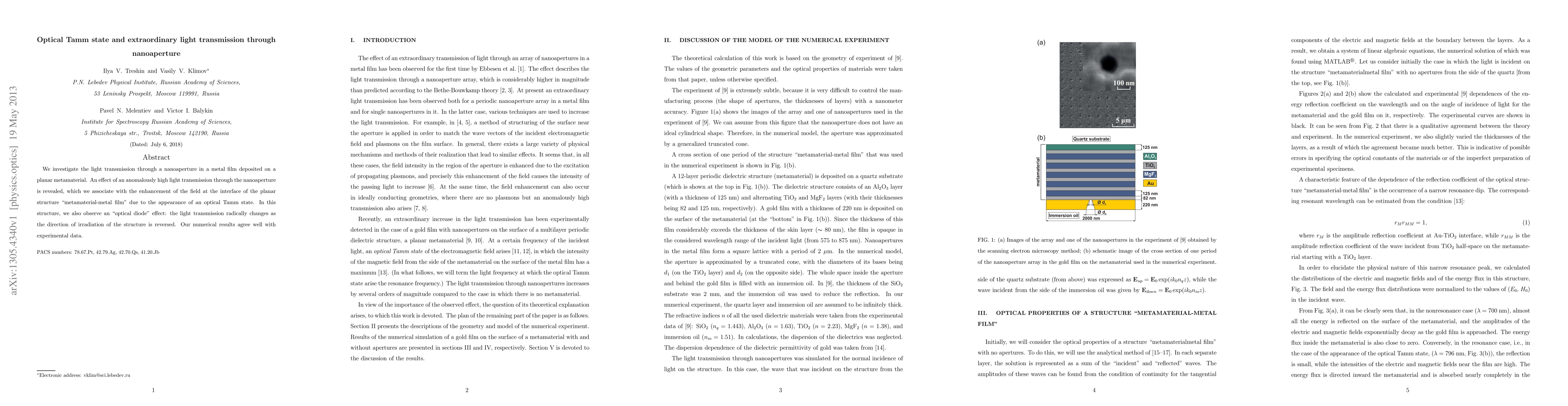 This paper explores light transmission through a nanoaperture in a metal film with a planar metamaterial, revealing anomalously high transmission linked to an optical Tamm state. It also observes an "optical diode" effect, where transmission changes drastically with the direction of light incidence, with numerical results matching experimental data.