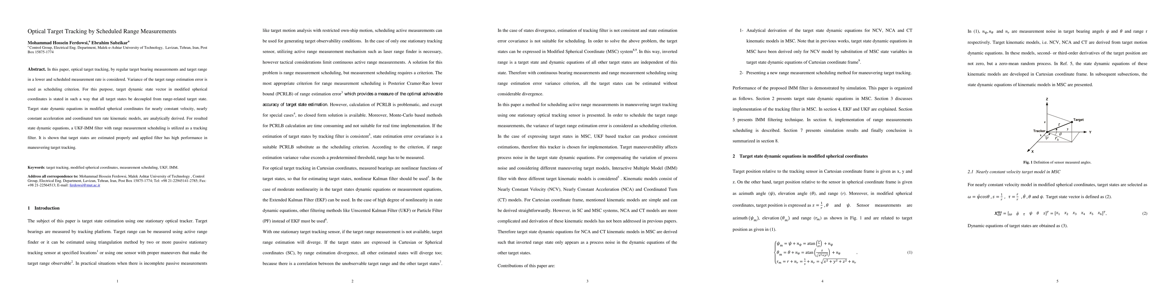 In this paper, optical target tracking, by regular target bearing measurements and target range in a lower and scheduled measurement rate is considered. Variance of the target range estimation error is used as scheduling criterion. For this purpose, target dynamic state vector in modified spherical coordinates is stated in such a way that all target states be decoupled from range-related target state. Target state dynamic equations in modified spherical coordinates for nearly constant velocity, nearly constant acceleration and coordinated turn rate kinematic models, are analytically derived. For resulted state dynamic equations, a UKF-IMM filter with range measurement scheduling is utilized as a tracking filter. It is shown that target states are estimated properly and applied filter has high performance in maneuvering target tracking.