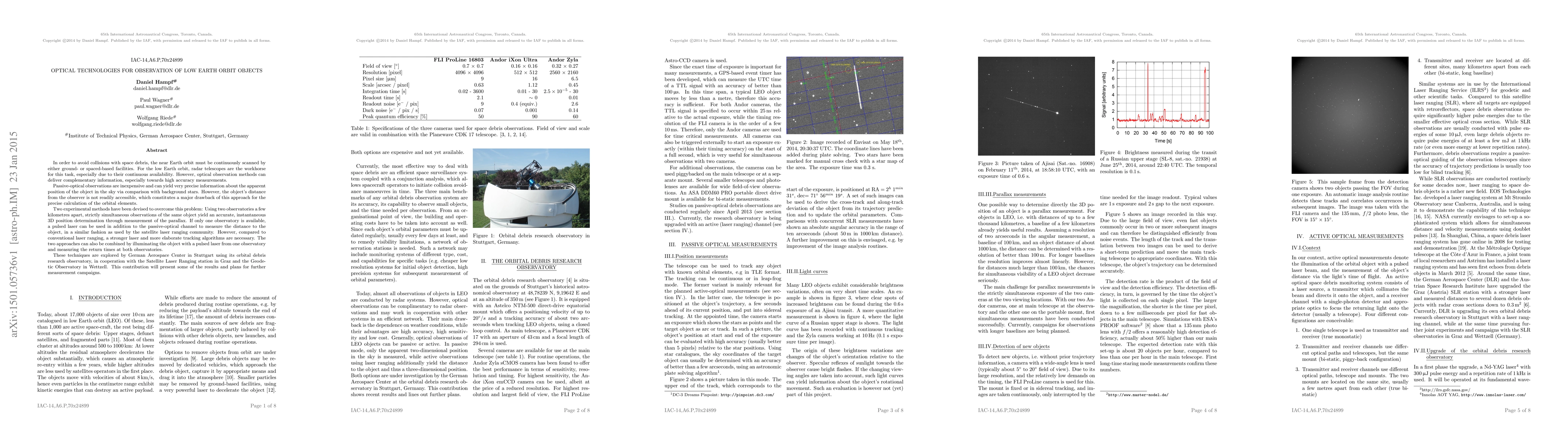 This paper discusses optical technologies for observing low Earth orbit objects, emphasizing radar's role and the complementary benefits of optical methods. It explores experimental techniques to measure distances using parallax and laser ranging, highlighting the German Aerospace Center's efforts in this field.