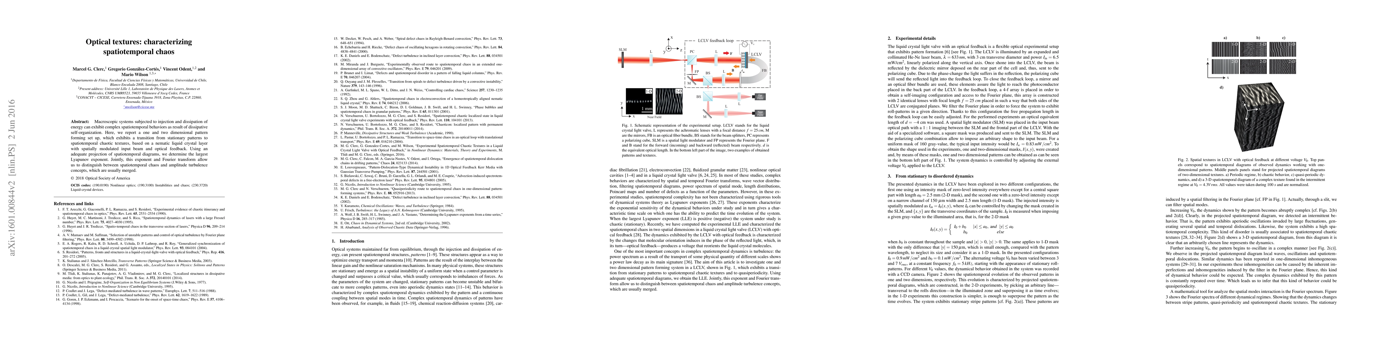 Macroscopic systems subjected to injection and dissipation of energy can exhibit complex spatiotemporal behaviors as result of dissipative self-organization. Here, we report a one and two dimensional pattern forming set up, which exhibits a transition from stationary patterns to spatiotemporal chaotic textures, based on a nematic liquid crystal layer with spatially modulated input beam and optical feedback. Using an adequate projection of spatiotemporal diagrams, we determine the largest Lyapunov exponent. Jointly, this exponent and Fourier transform allow us to distinguish between spatiotemporal chaos and amplitude turbulence concepts, which are usually merged.