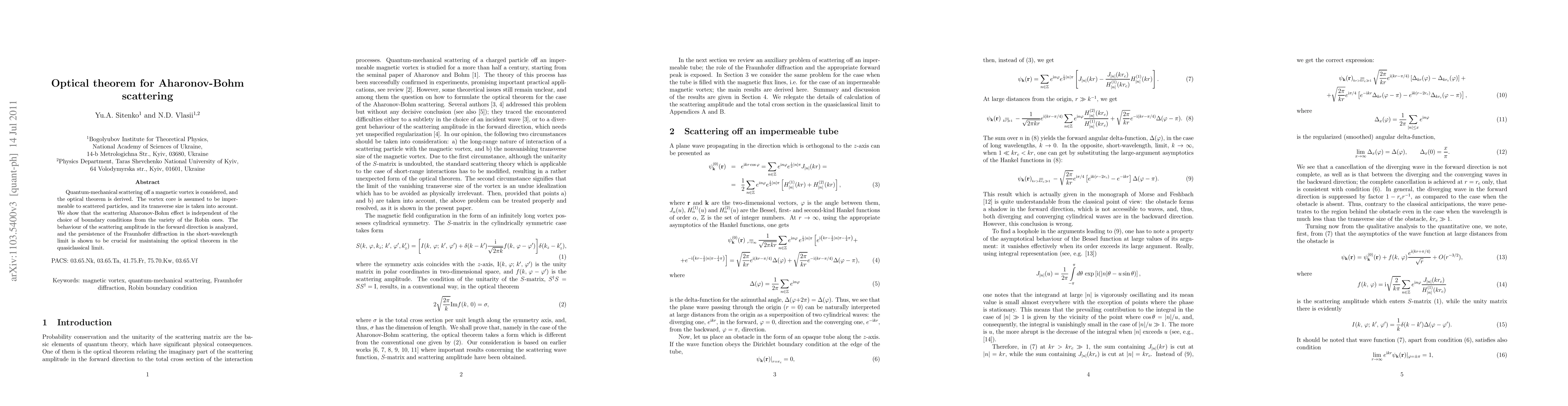 The paper presents a detailed derivation of the optical theorem for Aharonov-Bohm scattering, including the analysis of the scattering amplitude behavior in the forward direction and its persistence in the short-wavelength limit, which is essential for maintaining the optical theorem in the quasiclassical regime.
