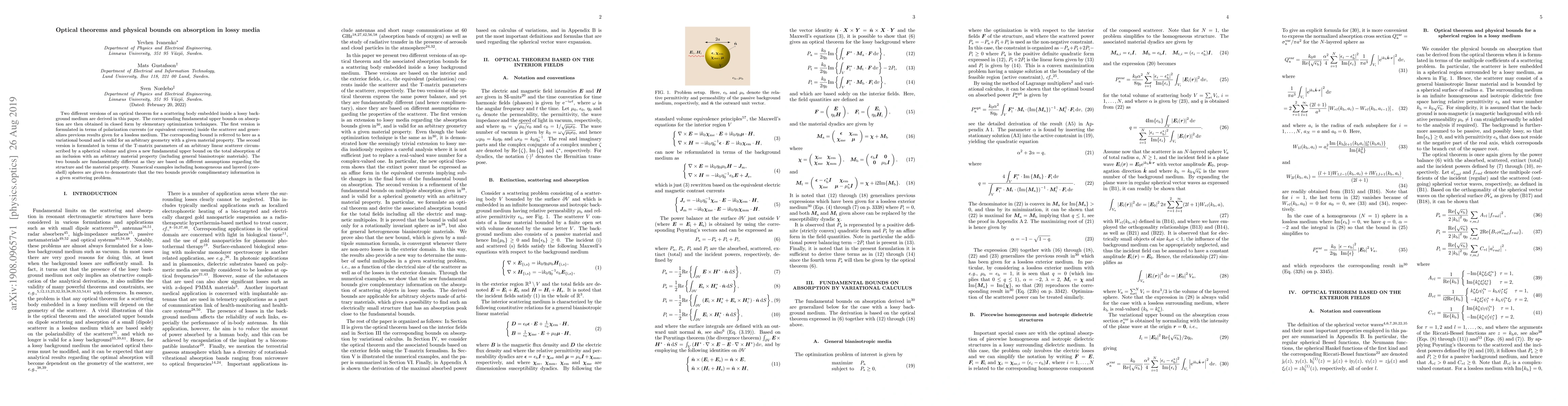 This paper derives two versions of an optical theorem for scattering bodies in lossy media, obtaining fundamental upper bounds on absorption through optimization techniques. The first bound, a variational bound, is based on polarization currents and generalizes previous results for lossless media. The second bound, based on T-matrix parameters, provides a new upper limit for total absorption, including bianisotropic materials. Numerical examples show the complementary nature of the two bounds.