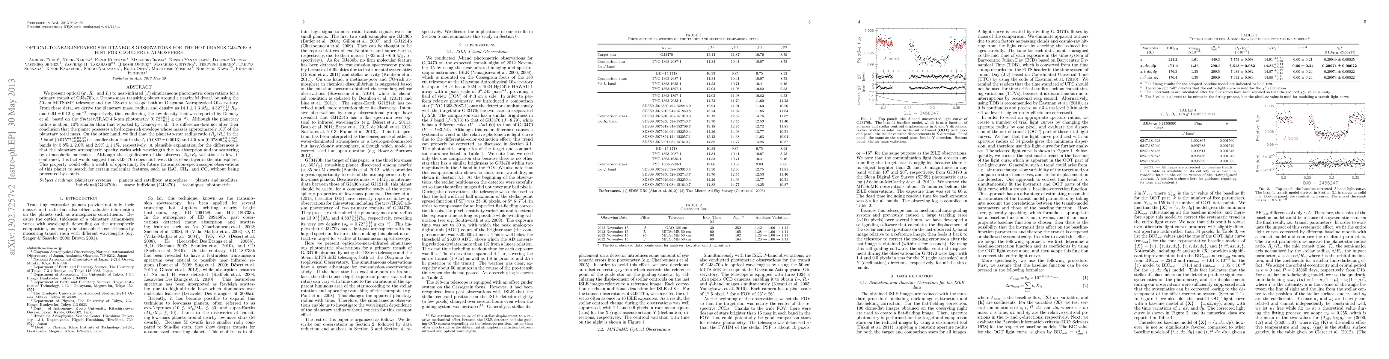 We present optical (g', R_c, and I_c) to near-infrared (J) simultaneous photometric observations for a primary transit of GJ3470b, a Uranus-mass transiting planet around a nearby M dwarf, by using the 50-cm MITSuME telescope and the 188-cm telescope, both at Okayama Astrophysical Observatory. From these data, we derive the planetary mass, radius, and density as 14.1 \pm 1.3 M_earth, 4.32^{+0.21}_{-0.10} R_earth, and 0.94 \pm 0.12 g cm^{-3}, respectively, thus confirming the low density that was reported by Demory et al. based on the Spitzer/IRAC 4.5-micron photometry (0.72^{+0.13}_{-0.12} g cm^{-3}). Although the planetary radius is about 10% smaller than that reported by Demory et al., this difference does not alter their conclusion that the planet possesses a hydrogen-rich envelope whose mass is approximately 10% of the planetary total mass. On the other hand, we find that the planet-to-star radius ratio (R_p/R_s) in the J band (0.07577^{+0.00072}_{-0.00075}) is smaller than that in the I_c (0.0802 \pm 0.0013) and 4.5-micron (0.07806^{+0.00052}_{-0.00054}) bands by 5.9% \pm 2.0% and 3.0% \pm 1.2%, respectively. A plausible explanation for the differences is that the planetary atmospheric opacity varies with wavelength due to absorption and/or scattering by atmospheric molecules. Although the significance of the observed R_p/R_s variations is low, if confirmed, this fact would suggest that GJ3470b does not have a thick cloud layer in the atmosphere. This property would offer a wealth of opportunity for future transmission-spectroscopic observations of this planet to search for certain molecular features, such as H2O, CH4, and CO, without being prevented by clouds.