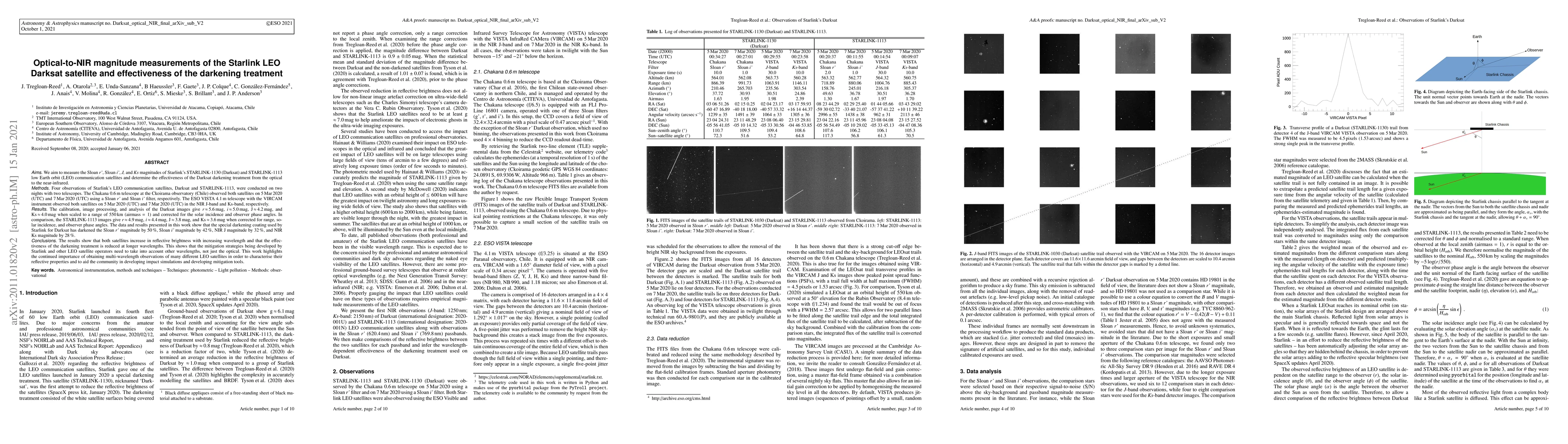 Four observations of Starlink's LEO communication satellites, Darksat and STARLINK-1113, were conducted on two nights with two telescopes. The Chakana 0.6\,m telescope at the Ckoirama observatory (Chile) observed both satellites on 5\,Mar\,2020 (UTC) and 7\,Mar\,2020 (UTC) using a Sloan r' and Sloan i' filter, respectively. The ESO VISTA 4.1\,m telescope with the VIRCAM instrument observed both satellites on 5\,Mar\,2020 (UTC) and 7\,Mar\,2020 (UTC) in the NIR J-band and Ks-band, respectively. The calibration, image processing, and analysis of the Darksat images give r\,$\approx$\,5.6\,mag, i\,$\approx$\,5.0\,mag, J\,$\approx$\,4.2\,mag, and Ks\,$\approx$\,4.0\,mag when scaled to a range of 550\,km (airmass $=1$) and corrected for the solar incidence and observer phase angles. In comparison, the STARLINK-1113 images give r\,$\approx$\,4.9\,mag, i\,$\approx$\,4.4\,mag, J\,$\approx$\,3.8\,mag, and Ks\,$\approx$\,3.6\,mag when corrected for range, solar incidence, and observer phase angles. The data and results presented in this work show that the special darkening coating used by Starlink for Darksat has darkened the Sloan r' magnitude by 50\,\%, Sloan i' magnitude by 42\,\%, NIR J magnitude by 32\,\%, and NIR Ks magnitude by 28\,\%. The results show that both satellites increase in reflective brightness with increasing wavelength and that the effectiveness of the darkening treatment is reduced at longer wavelengths. This shows that the mitigation strategies being developed by Starlink and other LEO satellite operators need to take into account other wavelengths, not just the optical. This work highlights the continued importance of obtaining multi-wavelength observations of many different LEO satellites in order to characterise their reflective properties and to aid the community in developing impact simulations and developing mitigation tools.