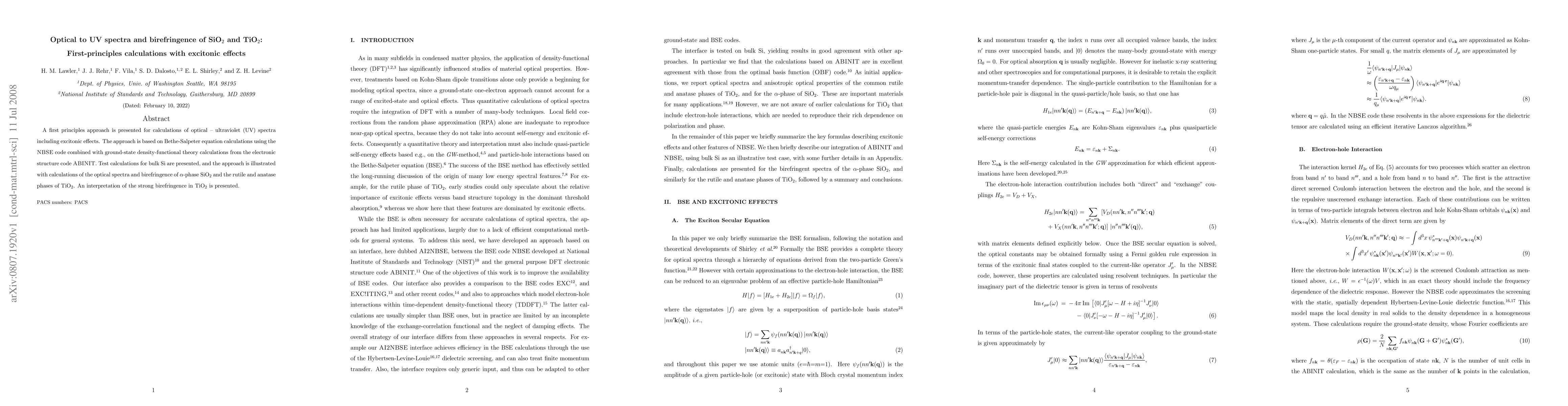 This paper presents a first-principles method for calculating optical-UV spectra with excitonic effects, combining Bethe-Salpeter equation and density-functional theory. It applies this method to study the optical spectra and birefringence of SiO$_2$ and TiO$_2$, explaining the strong birefringence in TiO$_2$ phases.
