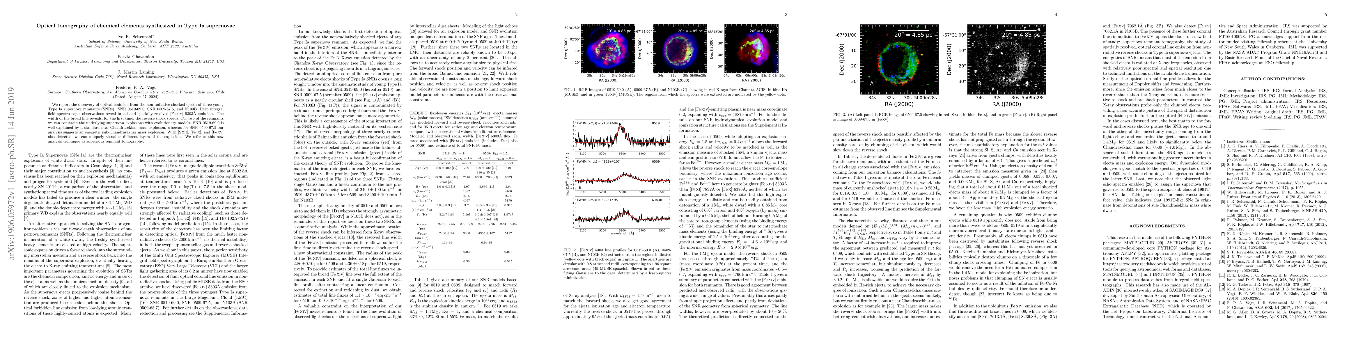 We report the discovery of optical emission from the non-radiative shocked ejecta of three young Type Ia supernova remnants (SNRs): SNR 0519-69.0, SNR 0509-67.5, and N103B. Deep integral field spectroscopic observations reveal broad and spatially resolved [Fe XIV] 5303{\AA} emission. The width of the broad line reveals, for the first time, the reverse shock speeds. For two of the remnants we can constrain the underlying supernova explosions with evolutionary models. SNR 0519-69.0 is well explained by a standard near-Chandrasekhar mass explosion, whereas for SNR 0509-67.5 our analysis suggests an energetic sub-Chandrasekhar mass explosion. With [S XII], [Fe IX], and [Fe XV] also detected, we can uniquely visualize different layers of the explosion. We refer to this new analysis technique as "supernova remnant tomography".