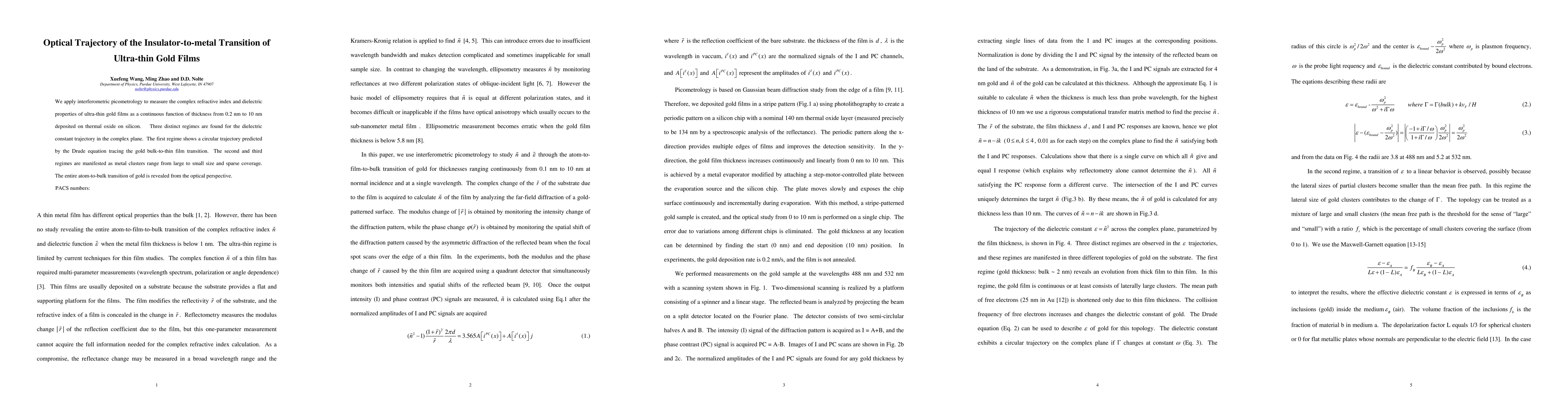 This study uses interferometric picometrology to measure the optical properties of ultra-thin gold films, revealing three distinct regimes in the dielectric constant trajectory as thickness varies from 0.2 nm to 10 nm. The transition from bulk to thin film behavior is characterized by a circular trajectory, while smaller metal clusters exhibit different dielectric properties.