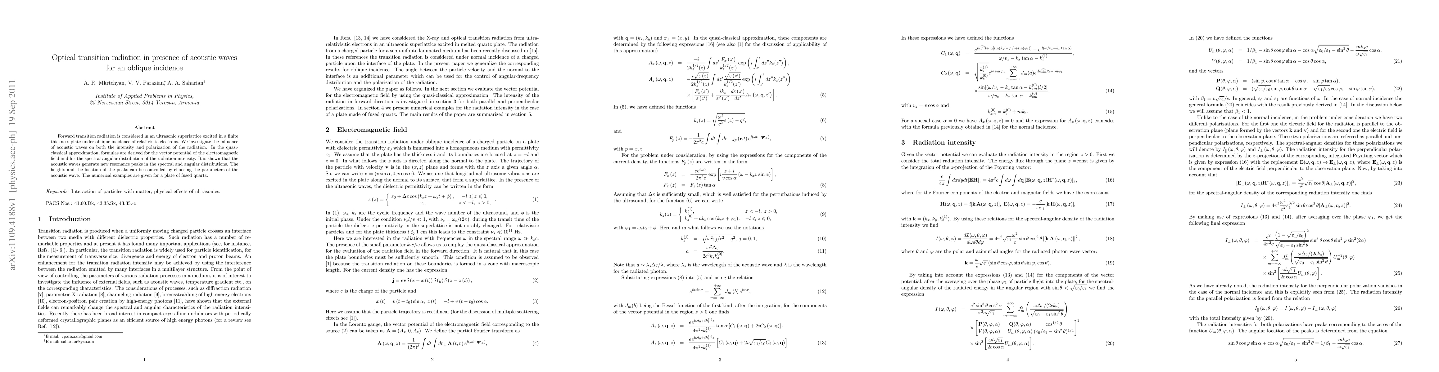 This paper investigates optical transition radiation in a finite thickness plate under oblique incidence of relativistic electrons, focusing on the impact of acoustic waves in an ultrasonic superlattice. The study reveals that acoustic waves introduce new resonance peaks in the spectral and angular distributions of the radiation, with their characteristics tunable by adjusting the acoustic wave parameters.