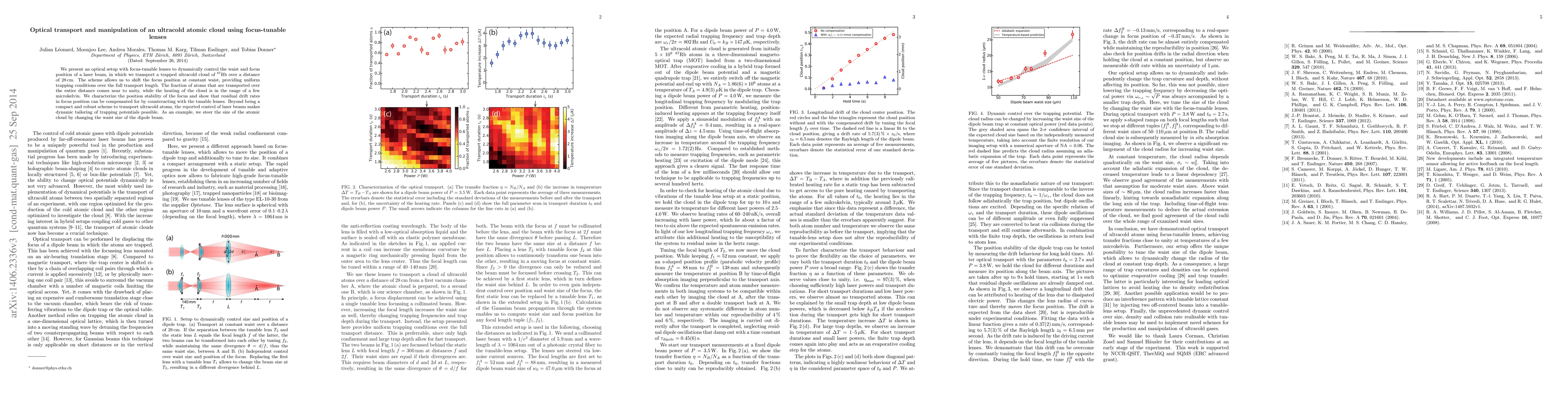 This paper details an optical setup using focus-tunable lenses to transport an ultracold 87-Rb atomic cloud over 28 cm with minimal heating, achieving near-unity atom transport efficiency. The system dynamically adjusts the laser beam's focus and waist, enabling precise control over trapping conditions and potential tailoring.