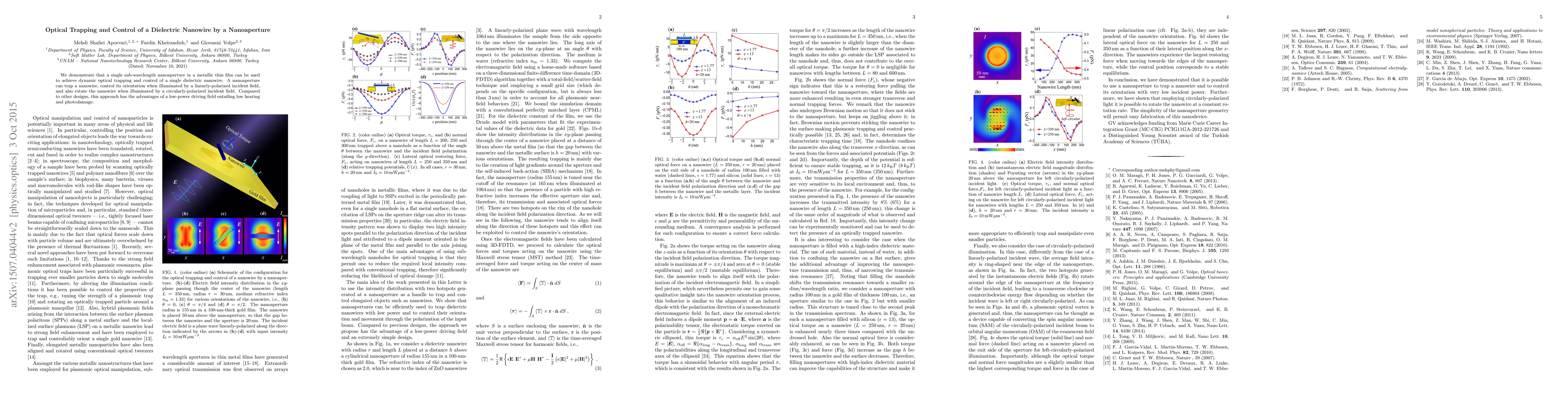 This paper demonstrates the use of a single sub-wavelength nanoaperture in a metallic film to optically trap and dynamically control a dielectric nanowire, achieving orientation and rotation control with low-power illumination, minimizing heating and photodamage.