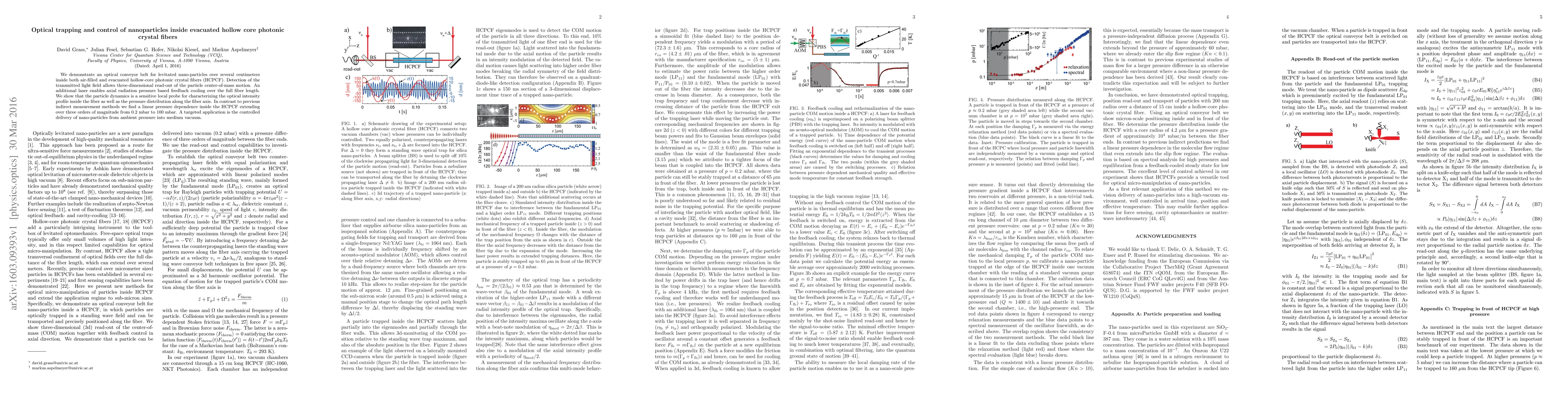This paper demonstrates the optical trapping and control of nanoparticles within evacuated hollow-core photonic crystal fibers, enabling precise levitation and feedback cooling over several centimeters. The study reveals a linear pressure dependence inside the fibers, providing a direct method for characterizing optical intensity profiles and pressure distributions.
