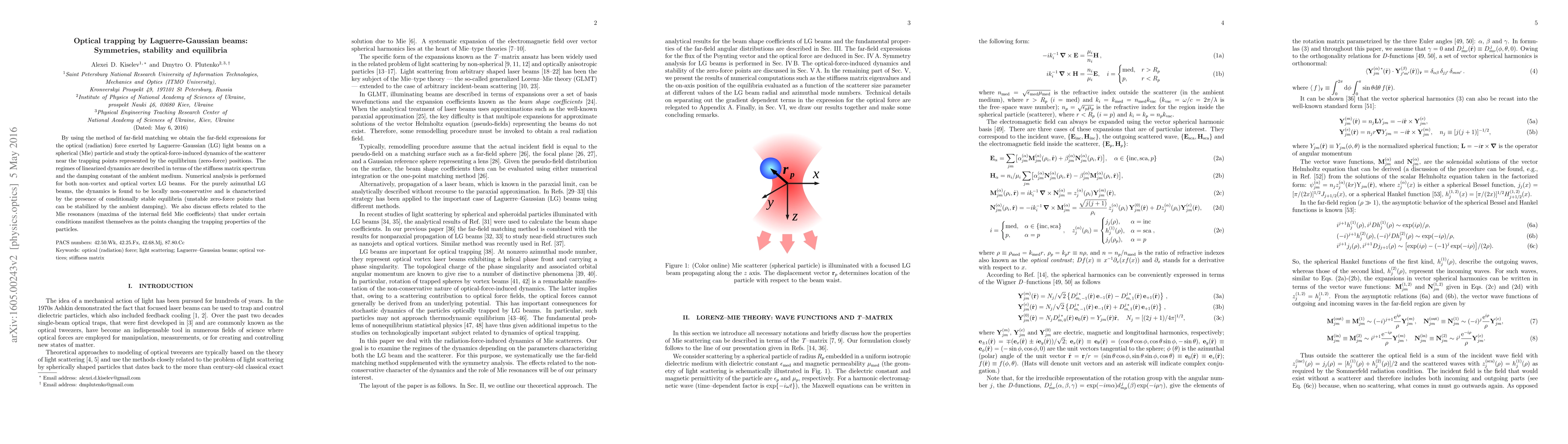 This paper evaluates the optical force exerted by Laguerre-Gaussian beams on spherical particles using the T-matrix formalism and far-field matching. It analyzes the dynamics near trapping points, revealing locally non-conservative behavior and conditionally stable equilibria influenced by ambient damping and Mie resonances.