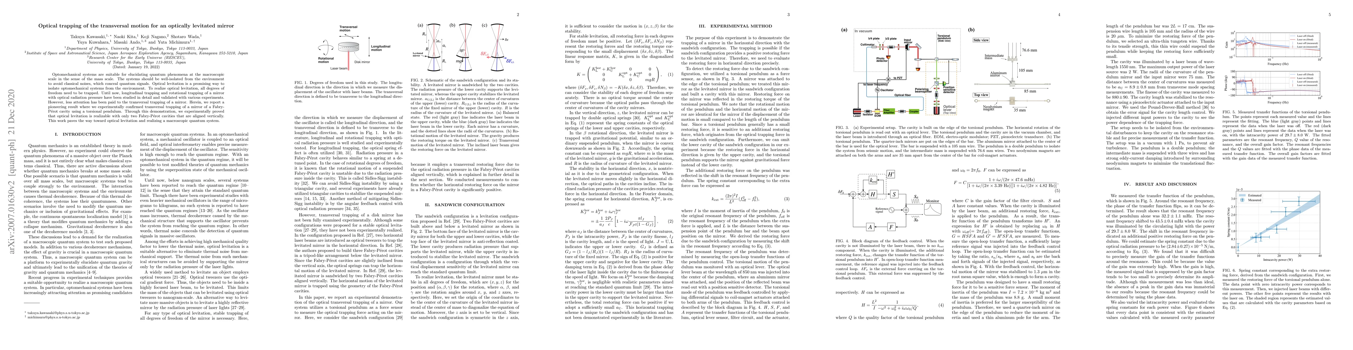 This paper reports the first experimental confirmation of optical trapping of the transversal motion for an optically levitated mirror using a torsional pendulum. This achievement demonstrates the feasibility of optical levitation with two vertically aligned Fabry-Pérot cavities, paving the way for macroscopic quantum systems.