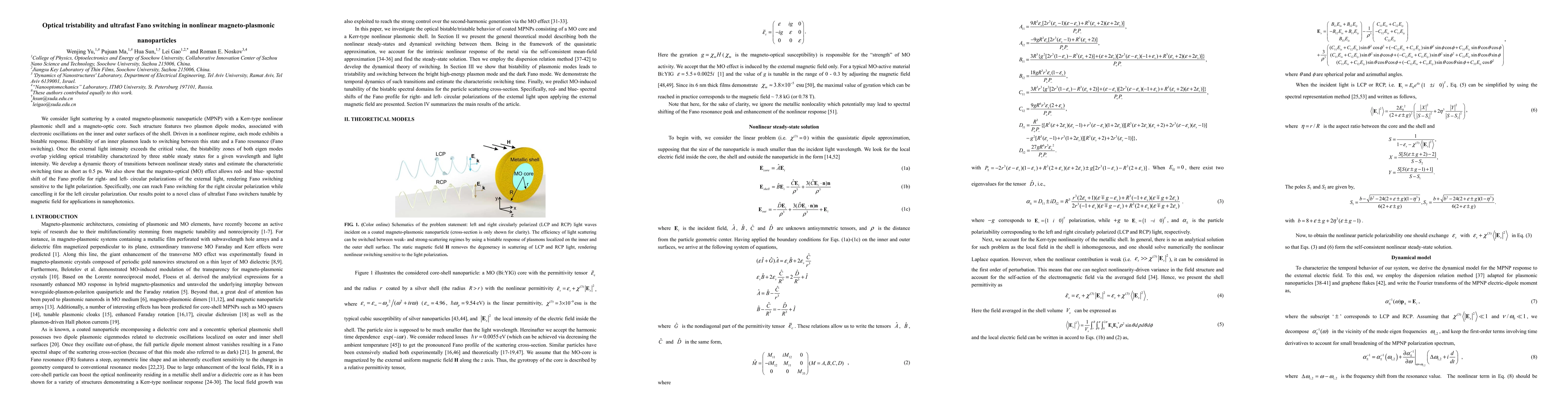 We consider light scattering by a coated magneto-plasmonic nanoparticle (MPNP) with a Kerr-type nonlinear plasmonic shell and a magneto-optic core. Such structure features two plasmon dipole modes, associated with electronic oscillations on the inner and outer surfaces of the shell. Driven in a nonlinear regime, each mode exhibits a bistable response. Bistability of an inner plasmon leads to switching between this state and a Fano resonance (Fano switching). Once the external light intensity exceeds the critical value, the bistability zones of both eigen modes overlap yielding optical tristability characterized by three stable steady states for a given wavelength and light intensity. We develop a dynamic theory of transitions between nonlinear steady states and estimate the characteristic switching time as short as 0.5 ps. We also show that the magneto-optical (MO) effect allows red- and blue- spectral shift of the Fano profile for right- and left- circular polarizations of the external light, rendering Fano switching sensitive to the light polarization. Specifically, one can reach Fano switching for the right circular polarization while cancelling it for the left circular polarization. Our results point to a novel class of ultrafast Fano switchers tunable by magnetic field for applications in nanophotonics.