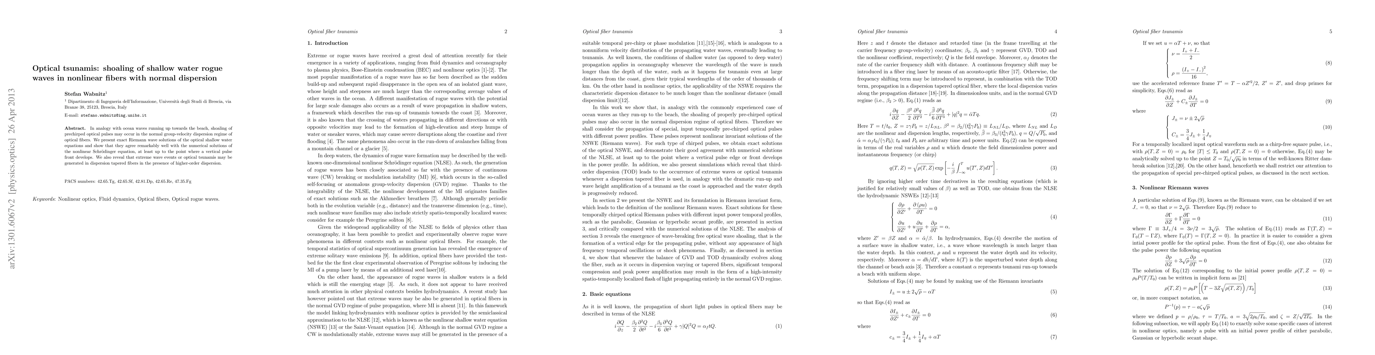 This paper explores the phenomenon of optical rogue waves, or "optical tsunamis," in nonlinear optical fibers with normal dispersion. It presents exact solutions to the optical shallow water equations that closely match numerical solutions of the nonlinear Schrödinger equation, highlighting the potential for extreme wave events in dispersion-tapered fibers due to higher-order dispersion effects.