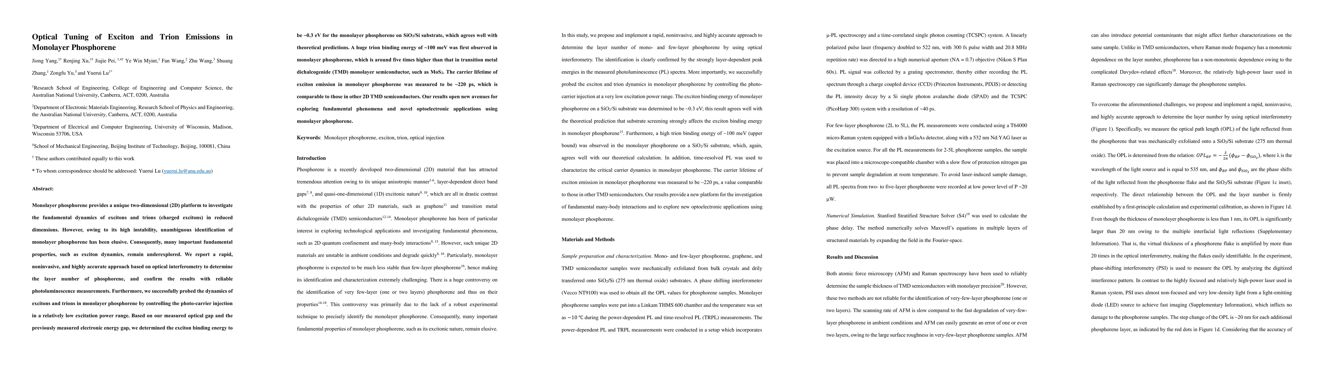 This paper reports a method for accurately determining the layer number of monolayer phosphorene using optical interferometry and confirms its properties with photoluminescence measurements. It reveals a high trion binding energy in monolayer phosphorene and provides insights into exciton dynamics, potentially paving the way for advanced optoelectronic applications.