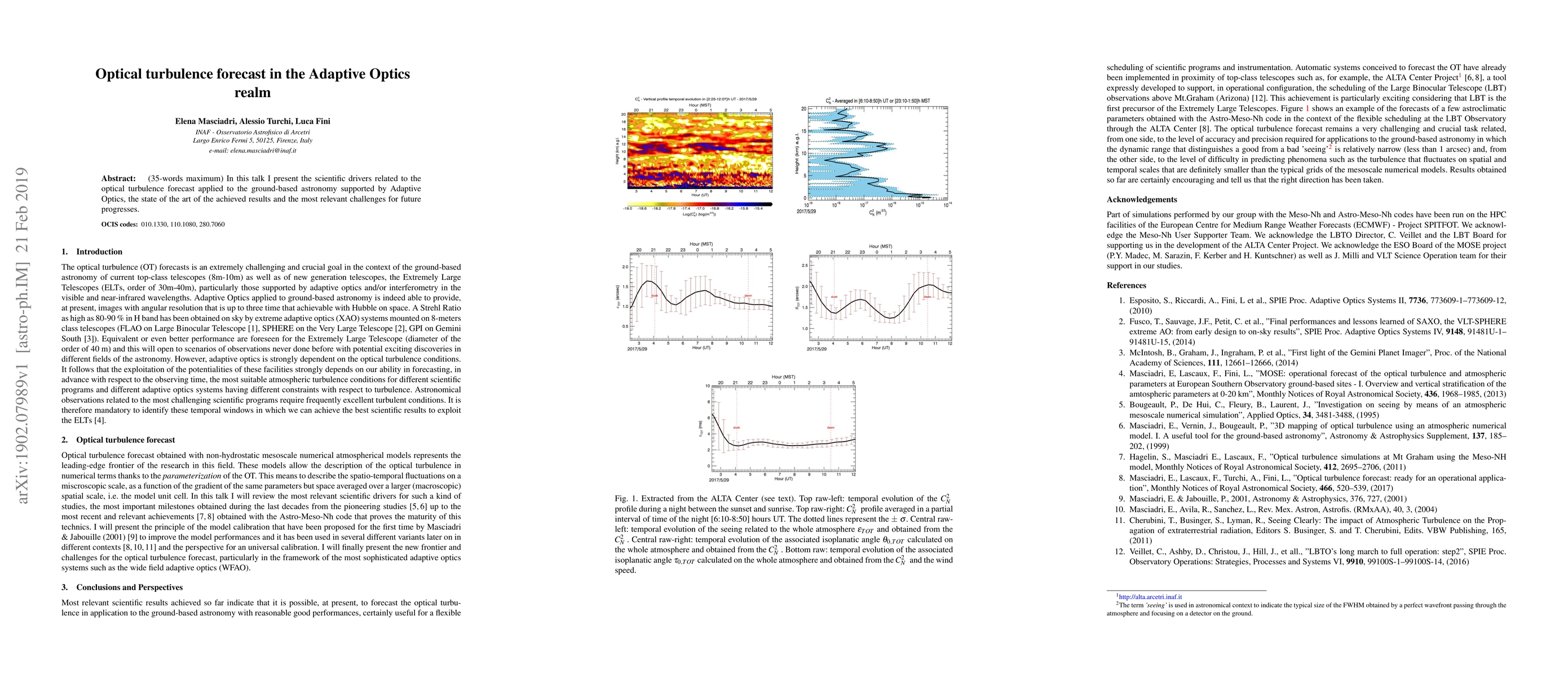 (35-words maximum) In this talk I present the scientific drivers related to the optical turbulence forecast applied to the ground-based astronomy supported by Adaptive Optics, the state of the art of the achieved results and the most relevant challenges for future progresses.