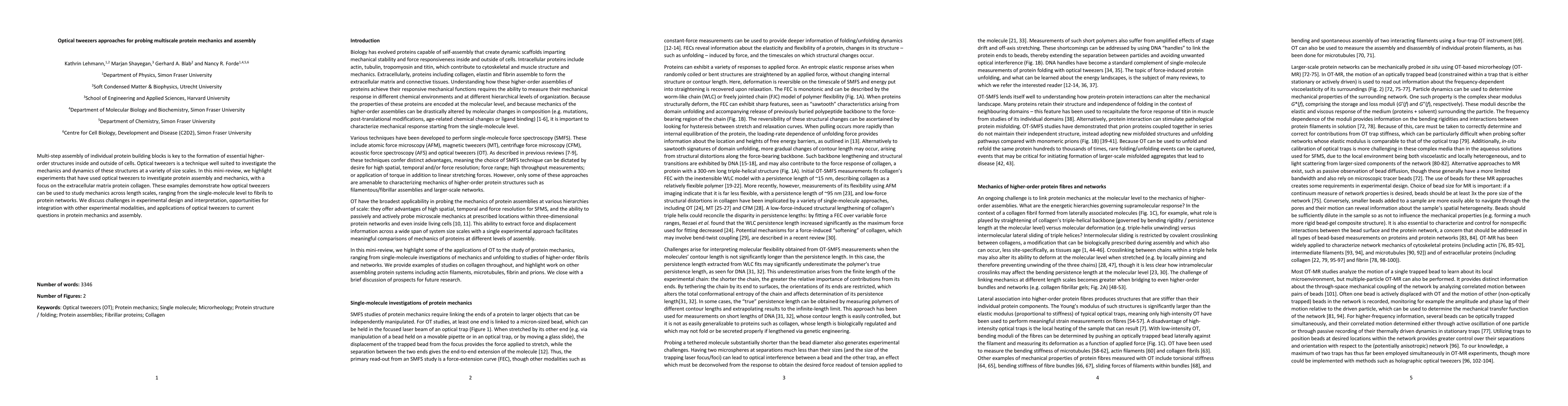 This paper reviews the use of optical tweezers for investigating multiscale protein mechanics and assembly, particularly focusing on collagen. The study highlights the technique's ability to explore protein dynamics from single molecules to networks, discussing experimental challenges and integration opportunities with other methods.