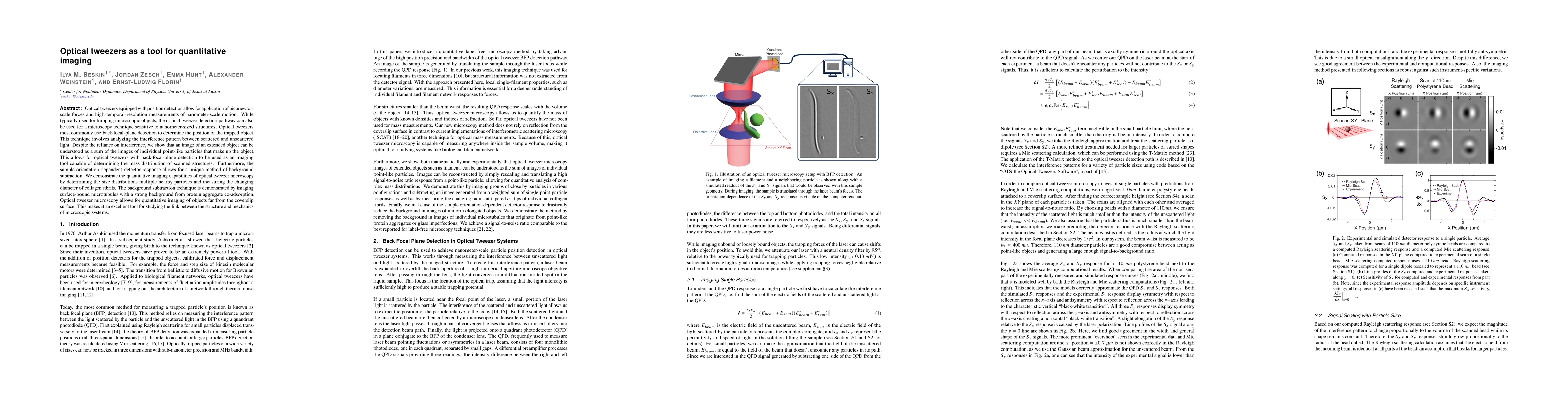 Optical tweezers equipped with position detection allow for application of piconewton-scale forces and high-temporal-resolution measurements of nanometer-scale motion. While typically used for trapping microscopic objects, the optical tweezer detection pathway can also be used for a microscopy technique sensitive to nanometer-sized structures. Optical tweezers most commonly use back-focal-plane detection to determine the position of the trapped object. This technique involves analyzing the interference pattern between scattered and unscattered light. Despite the reliance on interference, we show that an image of an extended object can be understood as a sum of the images of individual point-like particles that make up the object. This allows for optical tweezers with back-focal-plane detection to be used as an imaging tool capable of determining the mass distribution of scanned structures. Furthermore, the sample-orientation-dependent detector response allows for a unique method of background subtraction. We demonstrate the quantitative imaging capabilities of optical tweezer microscopy by determining the size distributions multiple nearby particles and measuring the changing diameter of collagen fibrils. The background subtraction technique is demonstrated by imaging surface-bound microtubules with a strong background from protein aggregate co-adsorption. Optical tweezer microscopy allows for quantitative imaging of objects far from the coverslip surface. This makes it an excellent tool for studying the link between the structure and mechanics of microscopic systems.