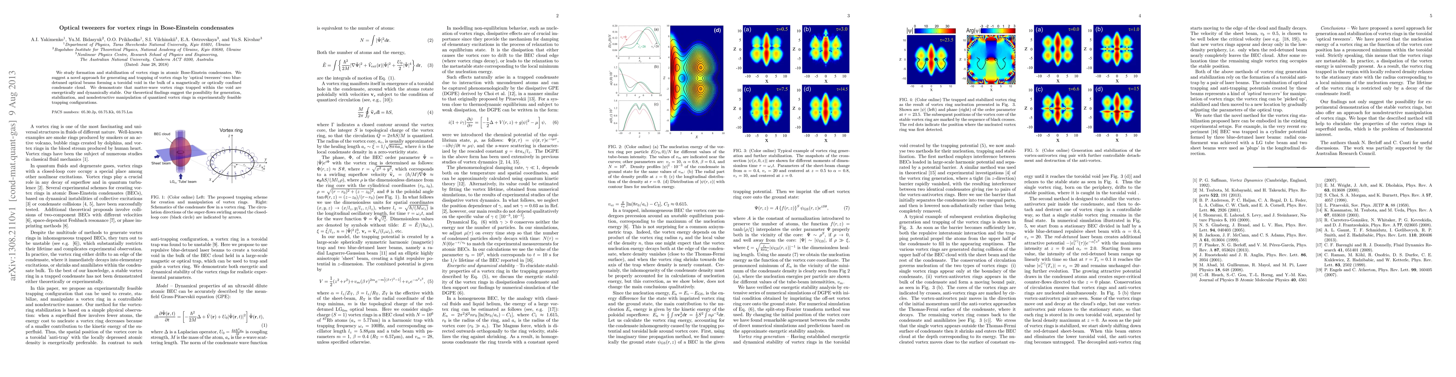 This paper explores the formation and stabilization of vortex rings in Bose-Einstein condensates using optical tweezers, demonstrating their energetic and dynamic stability. The proposed method involves two blue-detuned optical beams creating a toroidal void, enabling feasible experimental manipulation of quantized vortex rings.