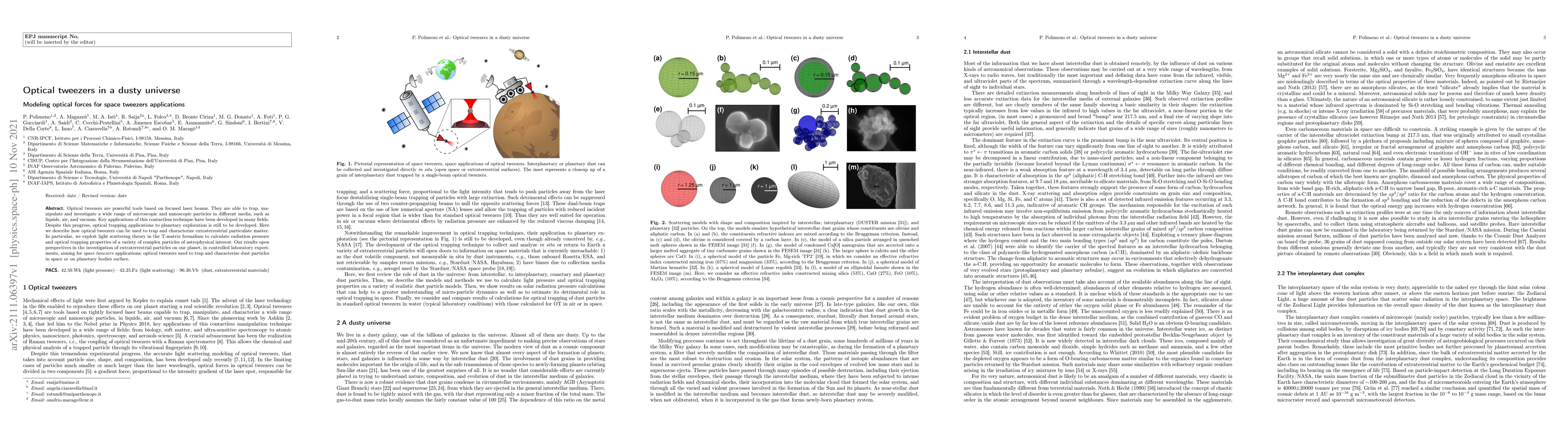 Optical tweezers are powerful tools based on focused laser beams. They are able to trap, manipulate and investigate a wide range of microscopic and nanoscopic particles in different media, such as liquids, air, and vacuum. Key applications of this contactless technique have been developed in many fields. Despite this progress, optical trapping applications to planetary exploration is still to be developed. Here we describe how optical tweezers can be used to trap and characterize extraterrestrial particulate matter. In particular, we exploit light scattering theory in the T-matrix formalism to calculate radiation pressure and optical trapping properties of a variety of complex particles of astrophysical interest. Our results open perspectives in the investigation of extraterrestrial particles on our planet, in controlled laboratory experiments, aiming for space tweezers applications: optical tweezers used to trap and characterize dust particles in space or on planetary bodies surface.