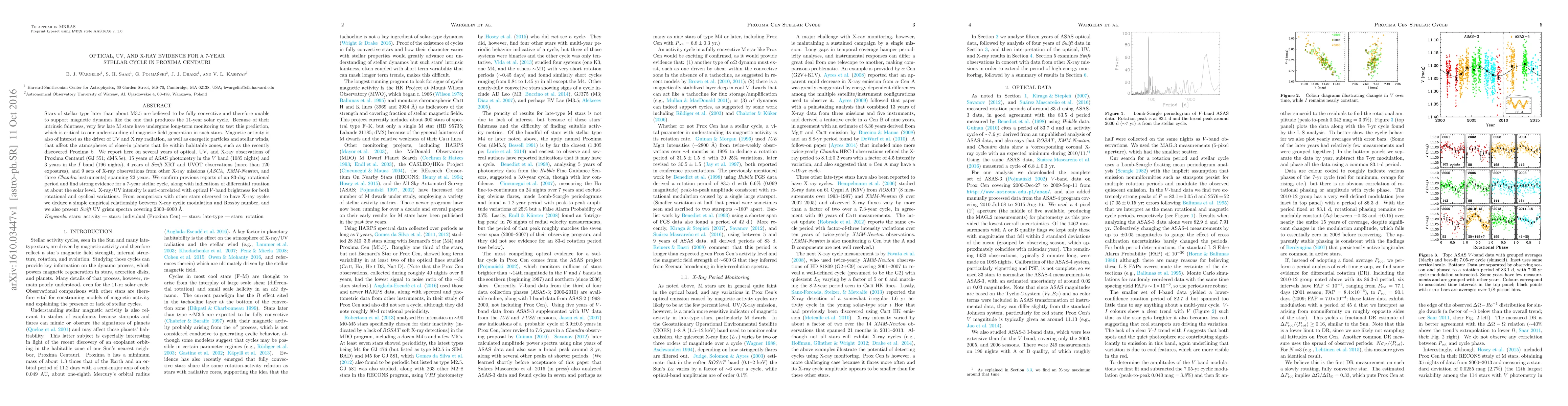 This paper reports long-term optical, UV, and X-ray observations of Proxima Centauri, revealing a 7-year stellar cycle, challenging the belief that fully convective M-type stars lack magnetic dynamos. The findings suggest differential rotation and an empirical relationship between X-ray cyclic modulation and Rossby number.