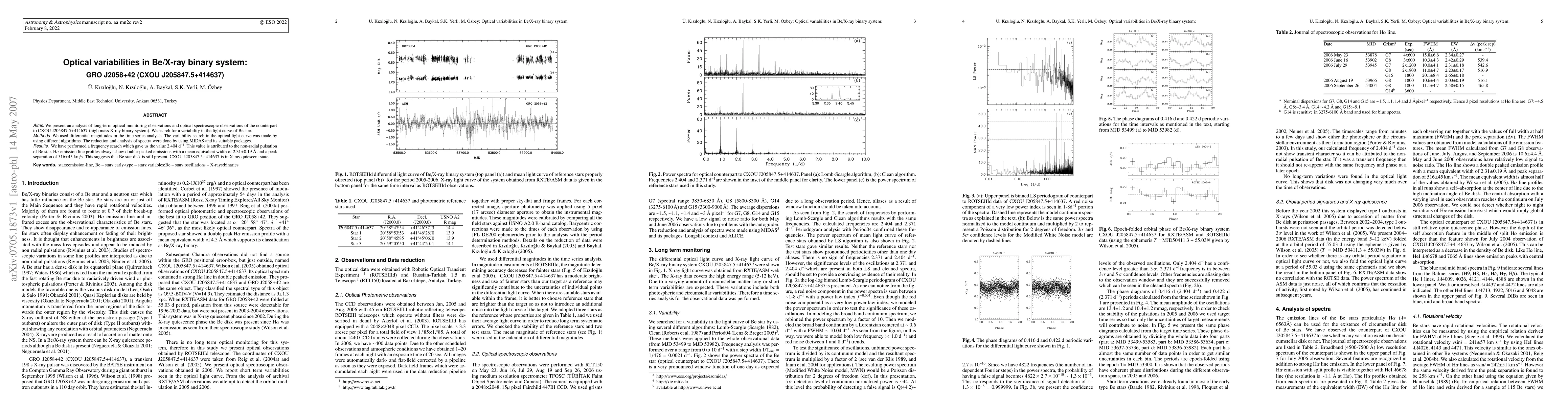 The study analyzes optical monitoring and spectroscopic observations of GRO J2058+42, a Be/X-ray binary system. It identifies a 2.404 day periodicity likely from Be star's non-radial pulsation, confirmed by double-peaked H-alpha emission line profiles indicating a persistent Be star disk. The system is currently in X-ray quiescence.