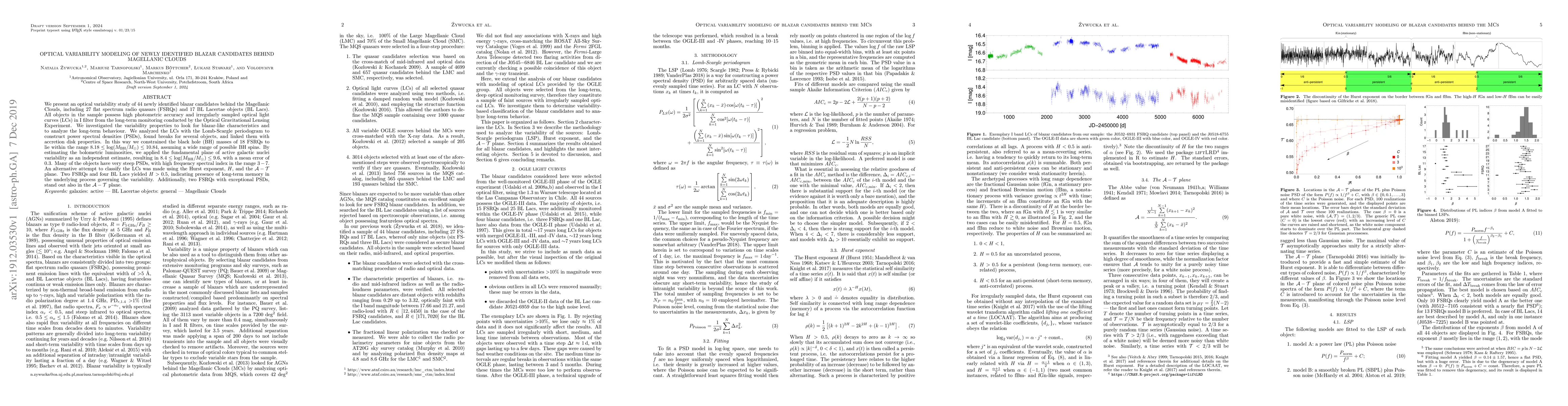 This study analyzes 44 blazar candidates behind the Magellanic Clouds for optical variability, revealing black hole masses ranging from 8 to 10 solar masses and identifying potential blazar-like characteristics.
