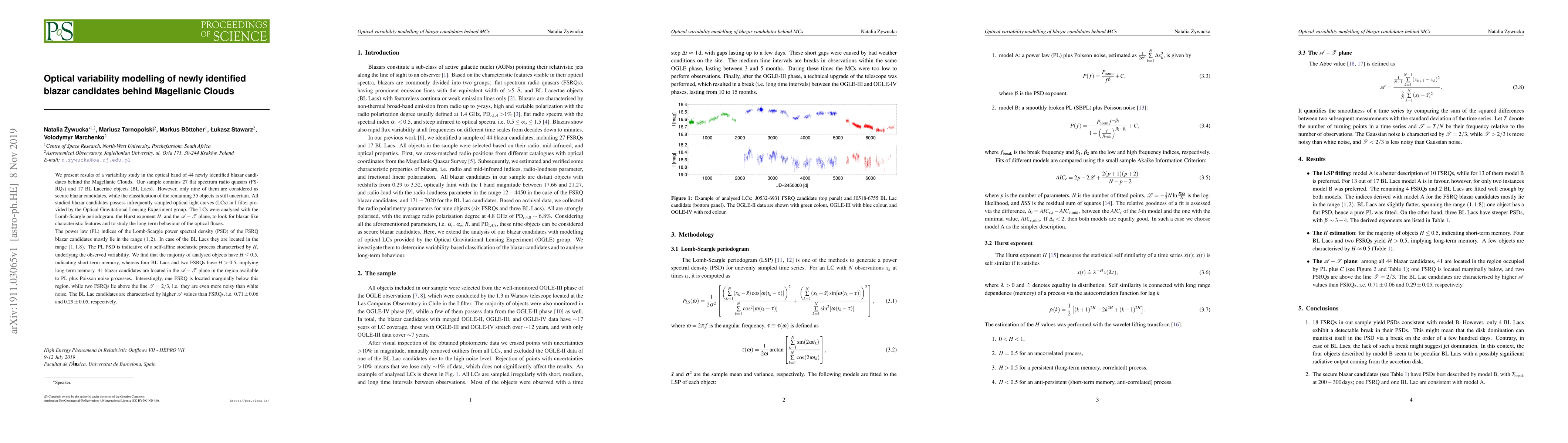 This study analyzes the optical variability of 44 newly identified blazar candidates behind the Magellanic Clouds, finding that only nine are secure blazars. The majority exhibit short-term memory in their variability, with BL Lacs showing higher $\mathcal{A}$ values than FSRQs, indicating different noise characteristics.
