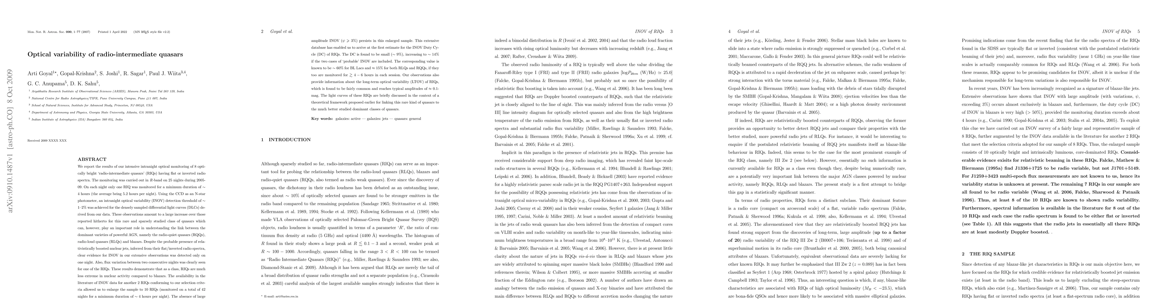 Researchers monitored 8 radio-intermediate quasars for 25 nights, finding they exhibit small intranight optical variability with a duty cycle of ~9% compared to blazars' 60%.