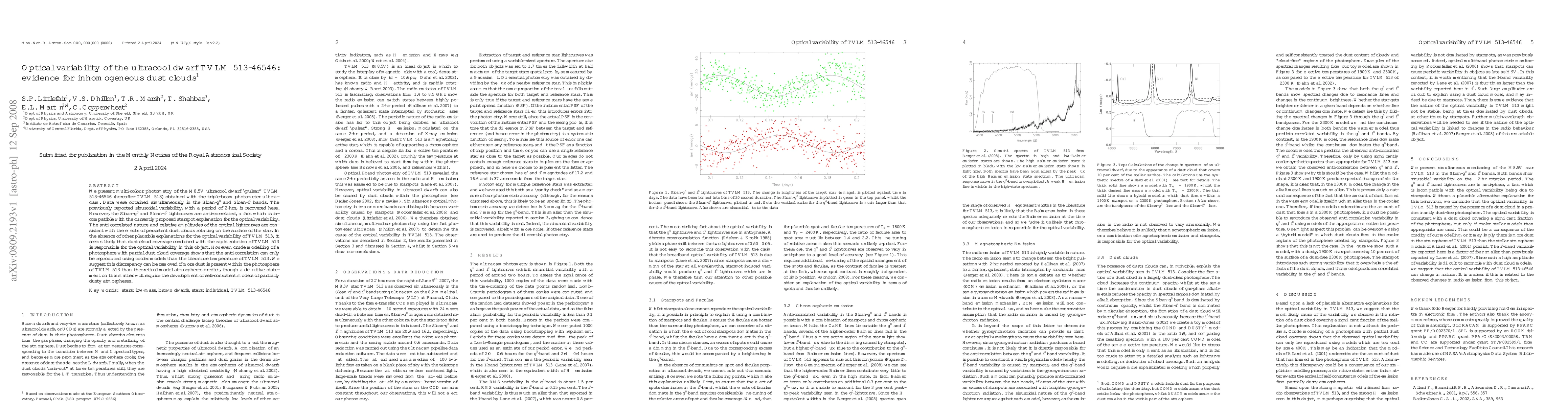 We present multi-colour photometry of the M8.5V ultracool dwarf "pulsar" TVLM 513-46546 (hereafter TVLM 513) obtained with the triple-beam photometer ULTRACAM. Data were obtained simultaneously in the Sloan-g' and Sloan-i' bands. The previously reported sinusoidal variability, with a period of 2-hrs, is recovered here. However, the Sloan-g' and Sloan-i' lightcurves are anti-correlated, a fact which is incompatible with the currently proposed starspot explanation for the optical variability. The anti-correlated nature and relative amplitudes of the optical lightcurves are consistent with the effects of persistent dust clouds rotating on the surface of the star. In the absence of other plausible explanations for the optical variability of TVLM 513, it seems likely that dust cloud coverage combined with the rapid rotation of TVLM 513 is responsible for the optical variability in this object. However, crude modelling of a photosphere with partial dust cloud coverage shows that the anti-correlation can only be reproduced using cooler models than the literature temperature of TVLM 513. We suggest this discrepancy can be removed if more dust is present within the photosphere of TVLM 513 than theoretical model atmospheres predict, though a definitive statement on this matter will require the development of self-consistent models of partially dusty atmospheres.