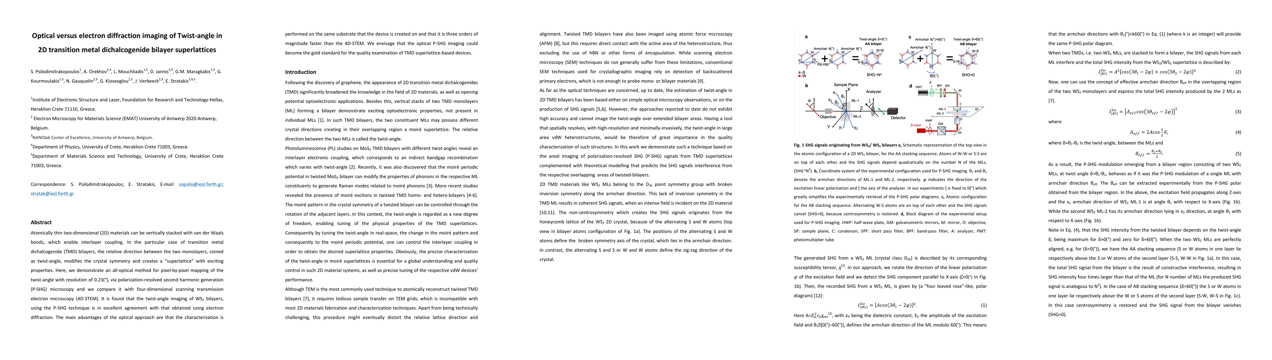 Atomically thin two-dimensional (2D) materials can be vertically stacked with van der Waals bonds, which enable interlayer coupling. In the particular case of transition metal dichalcogenide (TMD) bilayers, the relative direction between the two monolayers, coined as twist-angle, modifies the crystal symmetry and creates a superlattice with exciting properties. Here, we demonstrate an all-optical method for pixel-by-pixel mapping of the twist-angle with resolution of 0.23 degrees, via polarization-resolved second harmonic generation (P-SHG) microscopy and we compare it with four-dimensional scanning transmission electron microscopy (4D-STEM). It is found that the twist-angle imaging of WS2 bilayers, using the P-SHG technique is in excellent agreement with that obtained using electron diffraction. The main advantages of the optical approach are that the characterization is performed on the same substrate that the device is created on and that it is three orders of magnitude faster than the 4D-STEM. We envisage that the optical P-SHG imaging could become the gold standard for the quality examination of TMD superlattice-based devices.