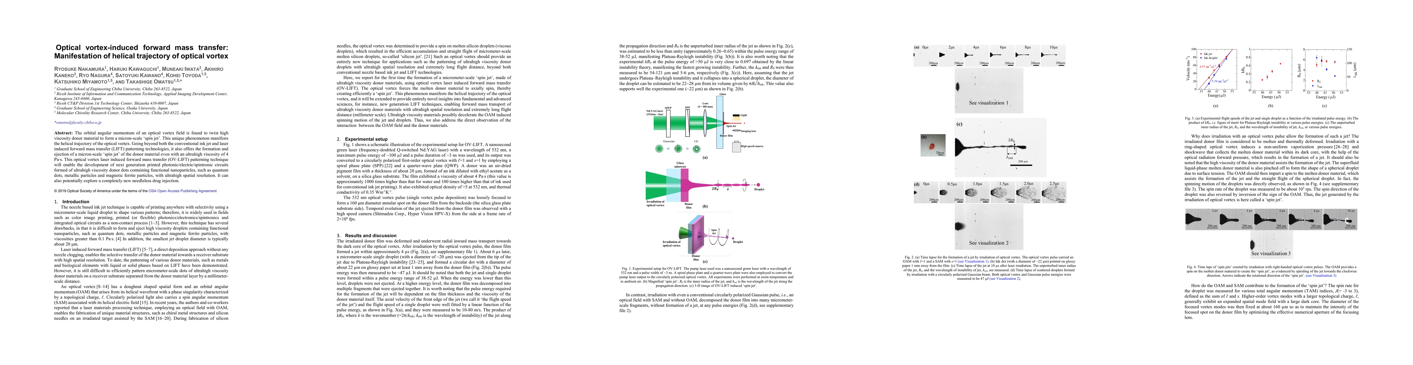 This paper explores the optical vortex-induced forward mass transfer technique, demonstrating the helical trajectory of optical vortices that twist high viscosity materials to form a micron-scale 'spin jet'. The novel OV-LIFT patterning method enables the precise formation of next-generation circuits with ultrahigh viscosity donor materials and could revolutionize needleless drug delivery.