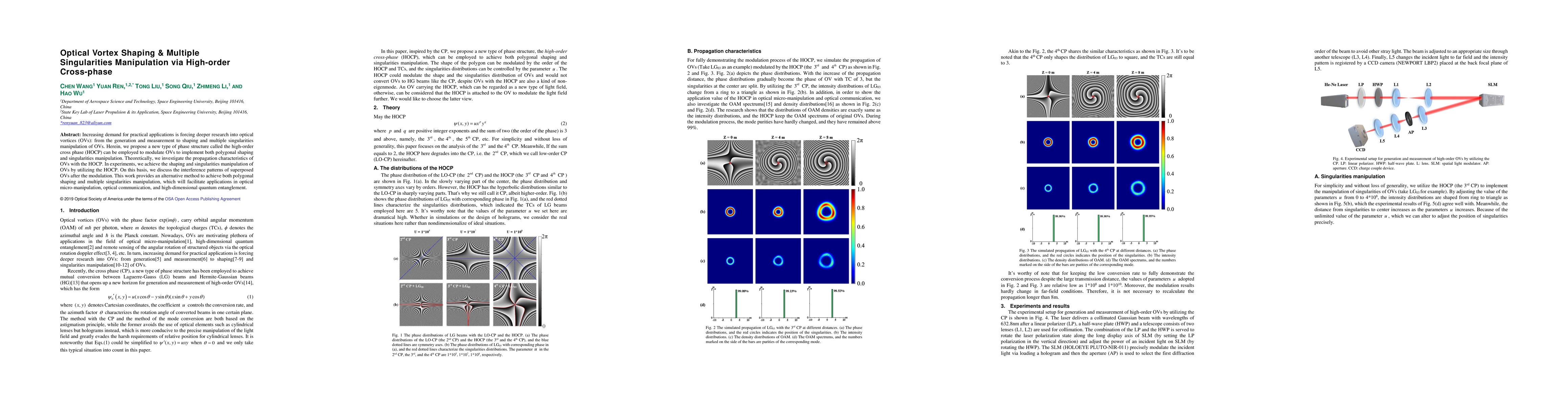 Increasing demand for practical applications is forcing deeper research into optical vortices (OVs): from the generation and measurement to shaping and multiple singularities manipulation of OVs. Herein, we propose a new type of phase structure called the high-order cross phase (HOCP) can be employed to modulate OVs to implement both polygonal shaping and singularities manipulation. Theoretically, we investigate the propagation characteristics of OVs with the HOCP. In experiments, we achieve the shaping and singularities manipulation of OVs by utilizing the HOCP. On this basis, we discuss the interference patterns of superposed OVs after the modulation. This work provides an alternative method to achieve both polygonal shaping and multiple singularities manipulation, which will facilitate applications in optical micro-manipulation, optical communication, and high-dimensional quantum entanglement.