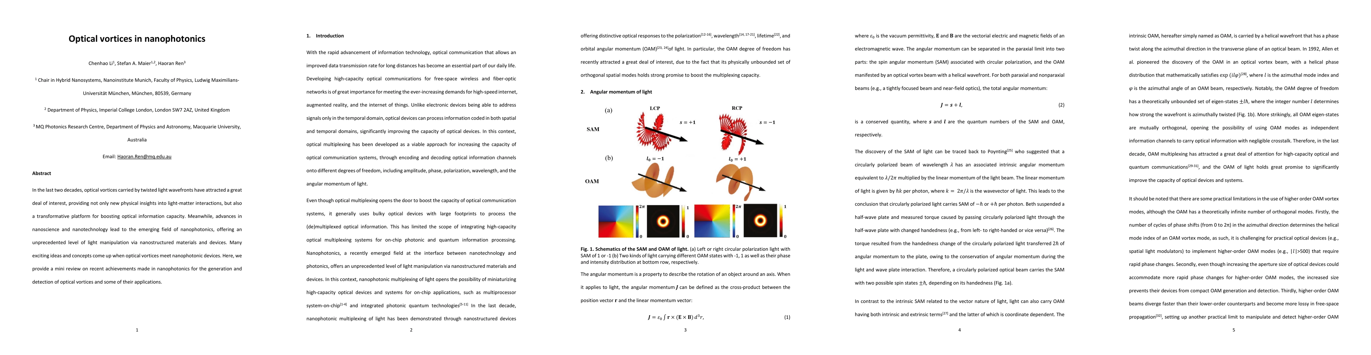 Recent advancements in nanophotonics have enabled the generation and detection of optical vortices, offering a transformative platform for boosting optical information capacity. This review highlights key findings on the application of nanophotonic devices in manipulating optical vortices.