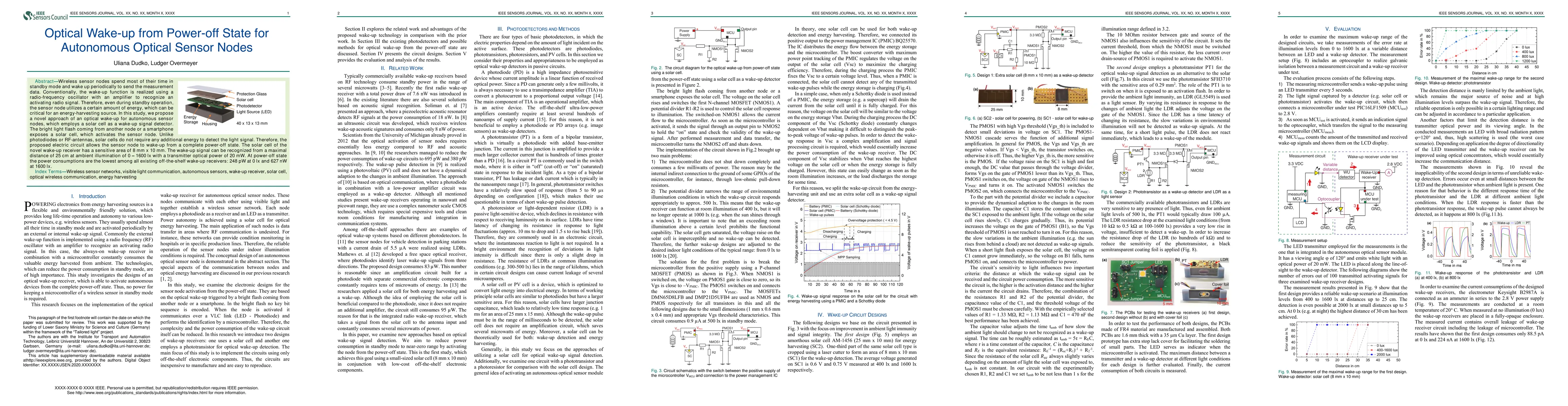 This paper proposes an innovative optical wake-up method for autonomous sensor nodes using solar cells to detect light signals, allowing nodes to activate from a complete power-off state with minimal energy consumption. The system achieves wake-up from up to 25 cm with a transmitter power of 20 mW, demonstrating the lowest power consumption in off-the-shelf wake-up receivers.