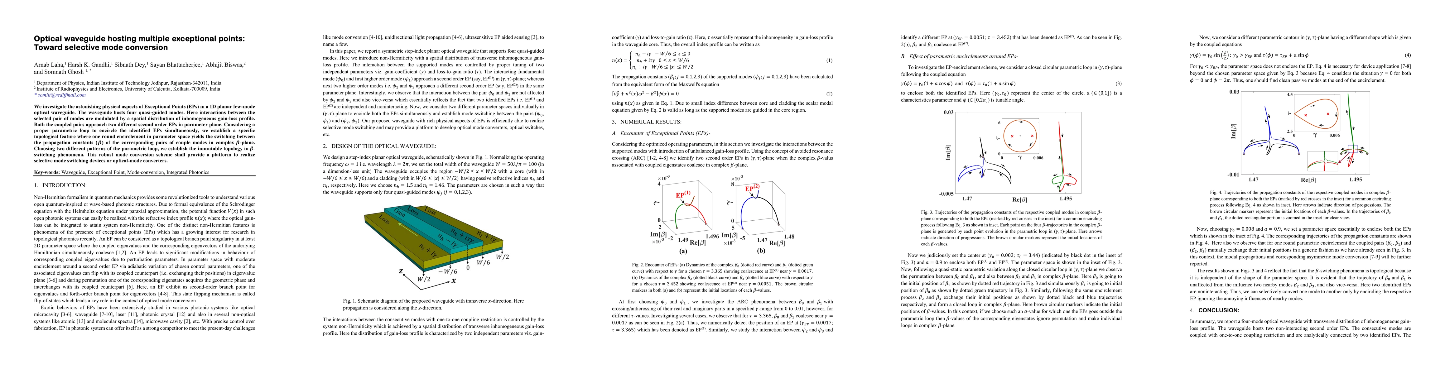 This paper explores the use of Exceptional Points in a 1D planar optical waveguide to achieve selective mode conversion. By modulating interactions between pairs of modes with a gain-loss profile, the authors demonstrate topological switching between propagation constants upon encircling identified EPs, establishing a robust method for selective optical-mode conversion.