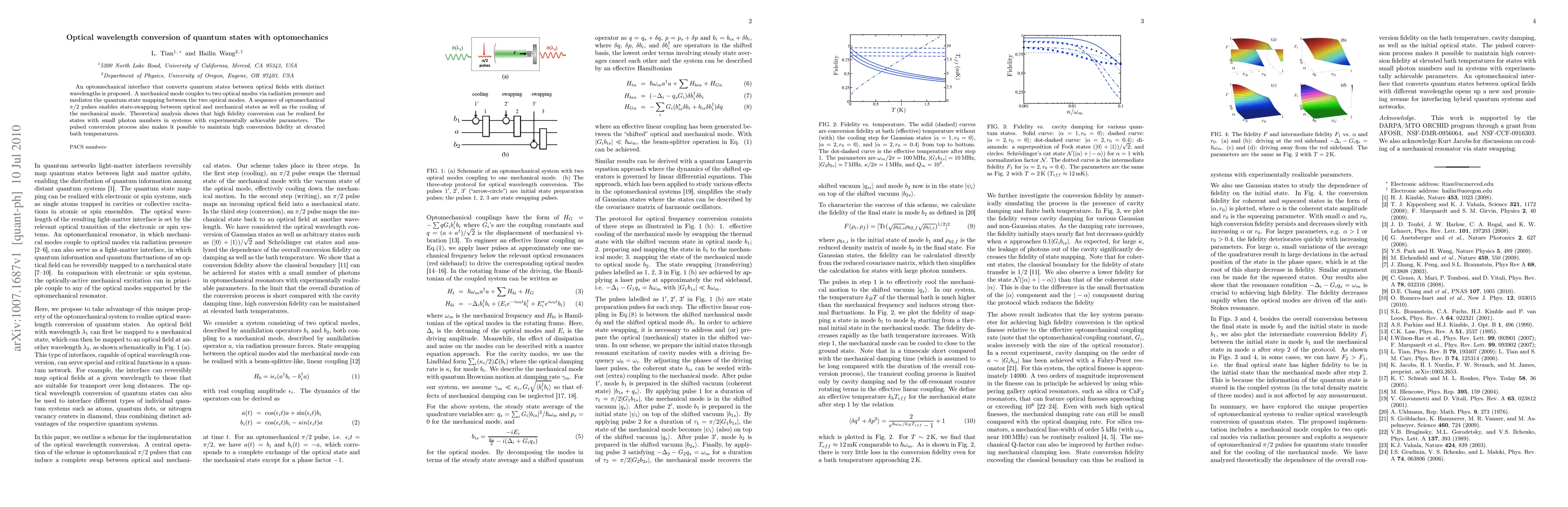 This paper proposes an optomechanical interface for converting quantum states between optical fields of different wavelengths using a mechanical mode that couples to the optical modes via radiation pressure. The method employs optomechanical $\pi/2$ pulses to achieve high fidelity state-swapping and cooling, demonstrating feasibility for small photon numbers and elevated temperatures.