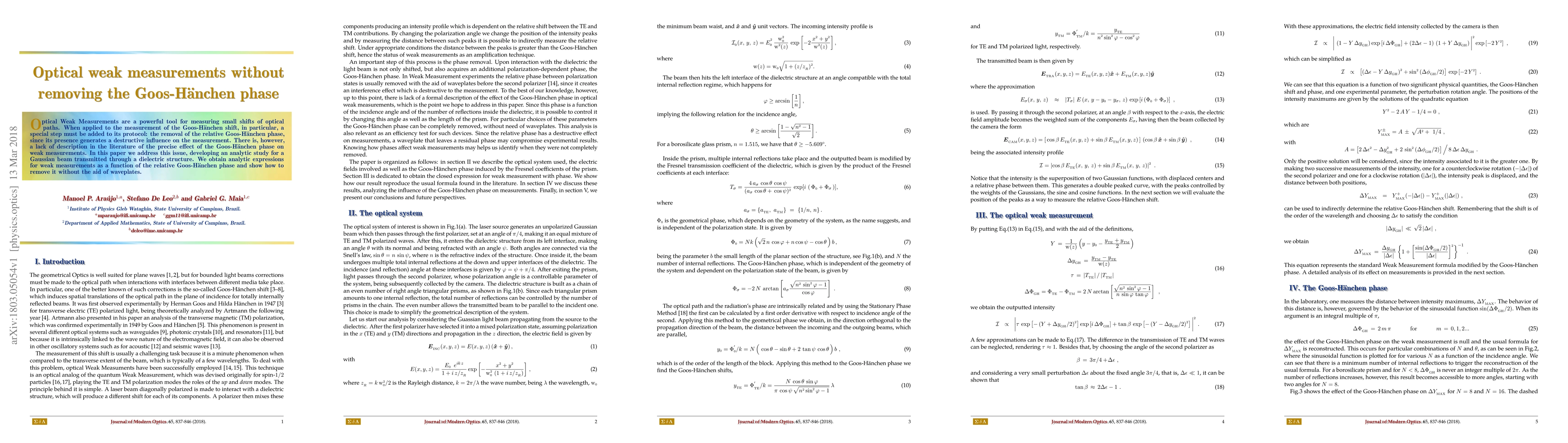 Optical weak measurements are a powerful tool for measuring small shifts of optical paths. When applied to the measurement of the Goos-Haenchen shift, in particular, a special step must be added to its protocol: the removal of the relative Goos-Haenchen phase, since its presence generates a destructive influence on the measurement. There is, however, a lack of description in the literature of the precise effect of the Goos-Haenchen phase on weak measurements. In this paper we address this issue, developing an analytic study for a Gaussian beam transmitted through a dielectric structure. We obtain analytic expressions for weak measurements as a function of the relative Goos-Haenchen phase and show how to remove it without the aid of waveplates.
