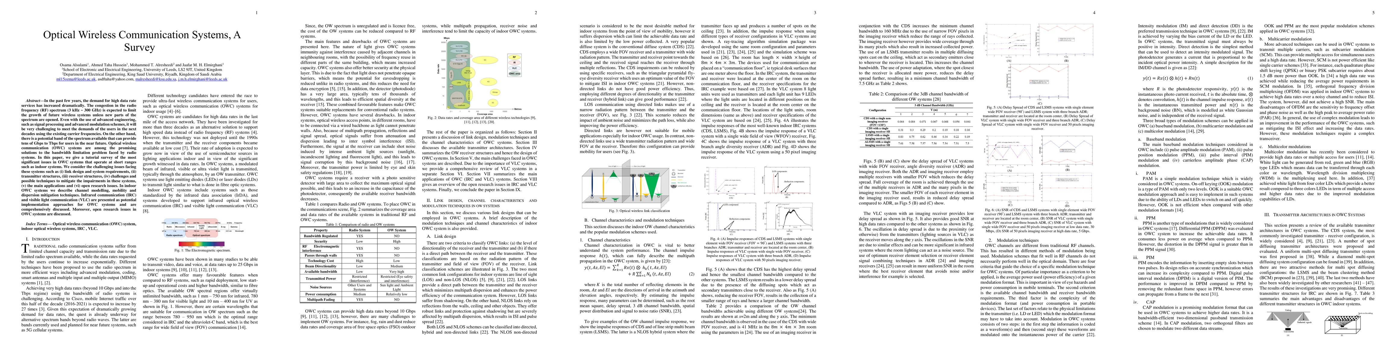 Optical wireless communication systems offer a promising solution to bandwidth limitations in radio frequency spectrum, with potential for tens of Gbps data rates. This paper surveys the key challenges and approaches for indoor OWC systems, including channel modeling, transmitter and receiver structures, and mitigation techniques.