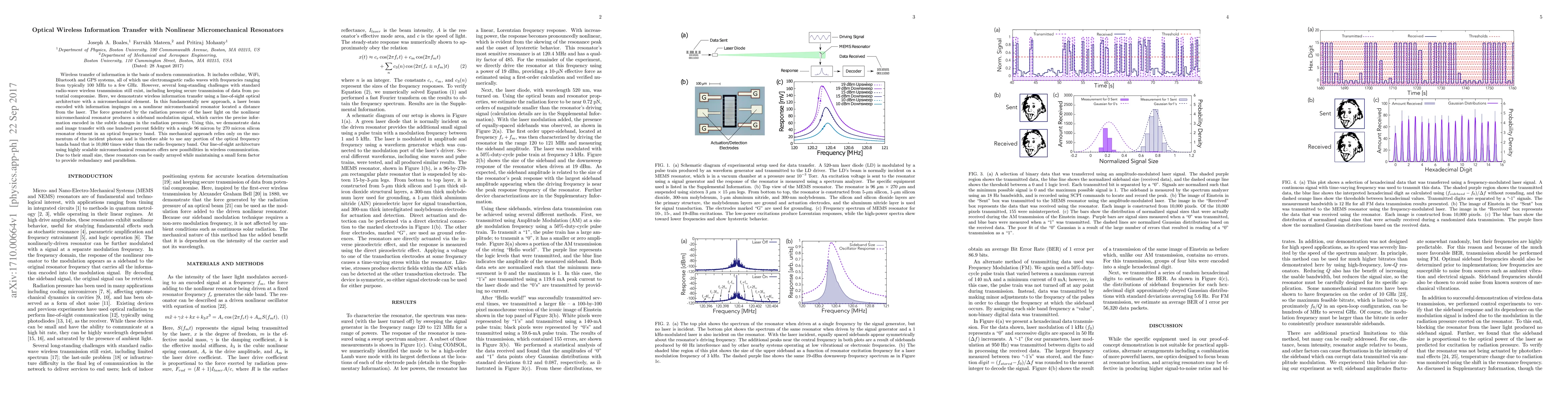 Wireless transfer of information is the basis of modern communication. It includes cellular, WiFi, Bluetooth and GPS systems, all of which use electromagnetic radio waves with frequencies ranging from typically 100 MHz to a few GHz. However, several long-standing challenges with standard radio-wave wireless transmission still exist, including keeping secure transmission of data from potential compromise. Here, we demonstrate wireless information transfer using a line-of-sight optical architecture with a micromechanical element. In this fundamentally new approach, a laser beam encoded with information impinges on a nonlinear micromechanical resonator located a distance from the laser. The force generated by the radiation pressure of the laser light on the nonlinear micromechanical resonator produces a sideband modulation signal, which carries the precise information encoded in the subtle changes in the radiation pressure. Using this, we demonstrate data and image transfer with one hundred percent fidelity with a single 96 micron by 270 micron silicon resonator element in an optical frequency band. This mechanical approach relies only on the momentum of the incident photons and is therefore able to use any portion of the optical frequency banda band that is 10,000 times wider than the radio frequency band. Our line-of-sight architecture using highly scalable micromechanical resonators offers new possibilities in wireless communication. Due to their small size, these resonators can be easily arrayed while maintaining a small form factor to provide redundancy and parallelism.
