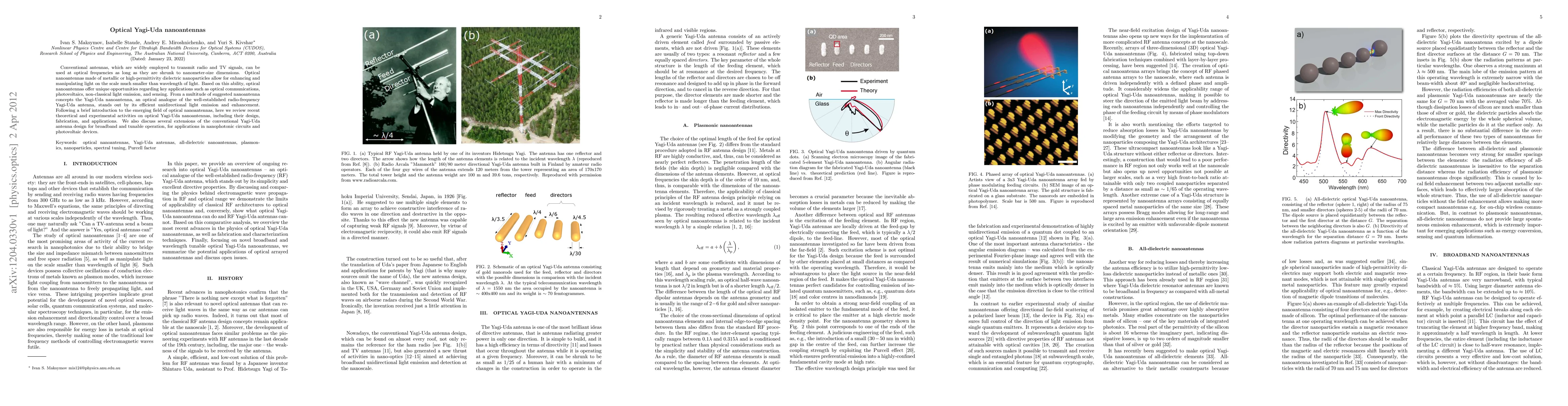 This paper reviews recent advancements in optical Yagi-Uda nanoantennas, highlighting their efficient unidirectional light emission and enhancement, and discussing their potential applications in optical communications, photovoltaics, and sensing, alongside fabrication techniques and design extensions for broader use.